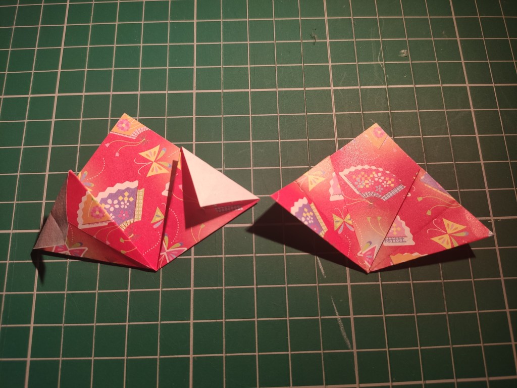 So there’s a standard way to fold a kusudama petal, but I learnt of a different way to do this. What you want to do is fold the triangular flap so that it’s hidden inside the unit. In the below image, the left unit is how you’d normally fold a unit (valley fold), and the right is when it’s mountain folded.