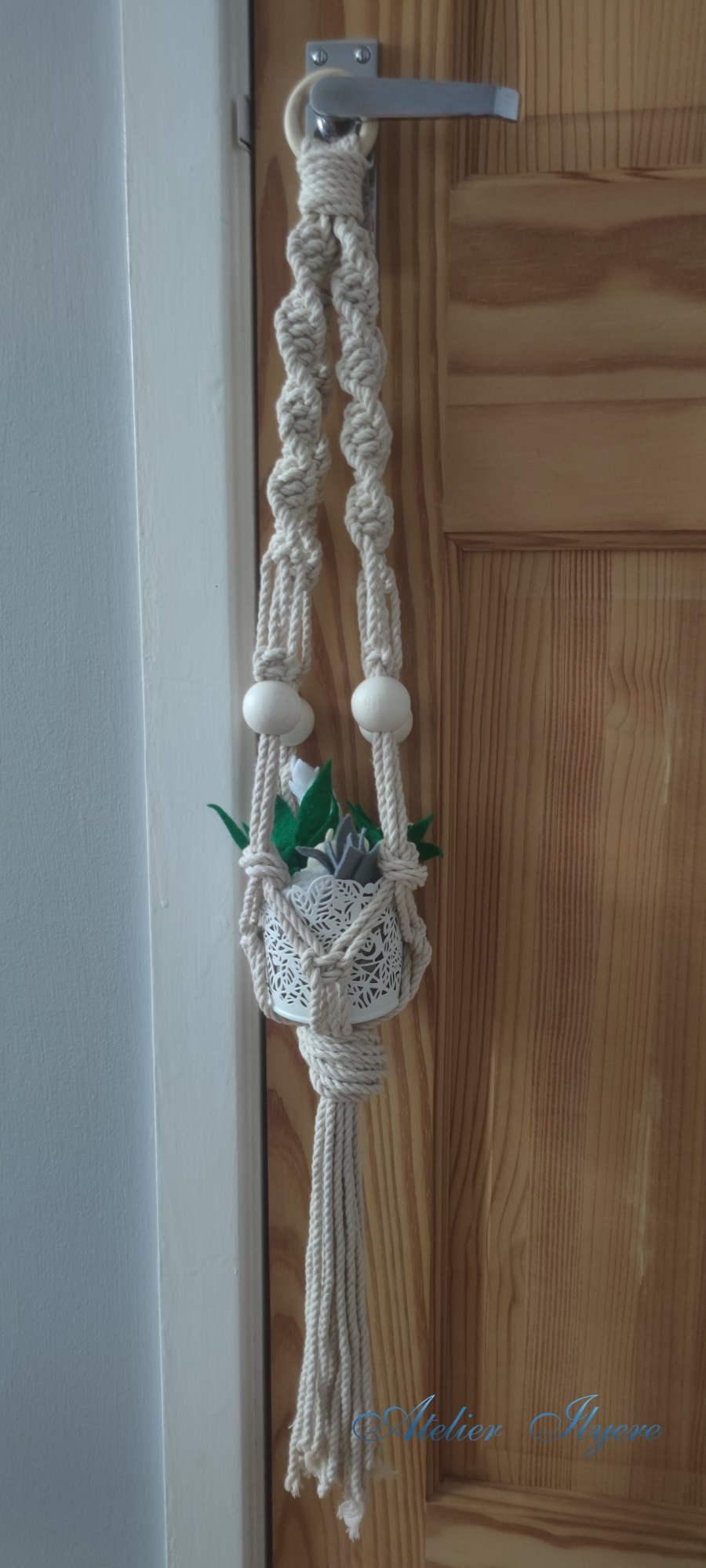 Once the size of the vase is measured, tie a huge knot below it and insert the vase. And done! I don’t have a dedicated place to hang this yet as I’m still deciding where to put a ceiling hook in, so it is staying on my door handle for now.
