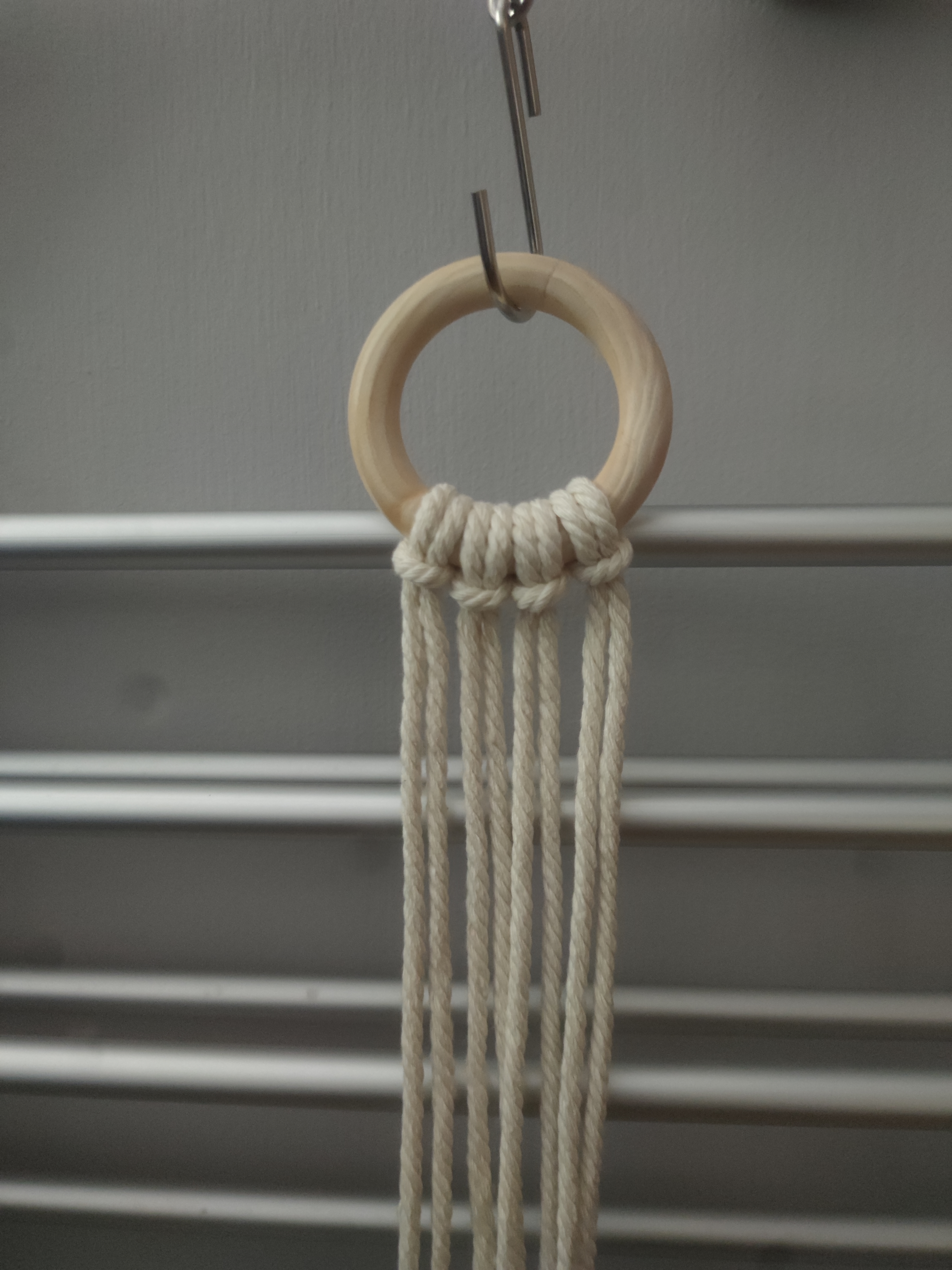 I mostly followed the tutorial by using a 6cm wooden ring and 5mm macramé cord. I think you will need about 45m worth of cord but it will depend on the last step.