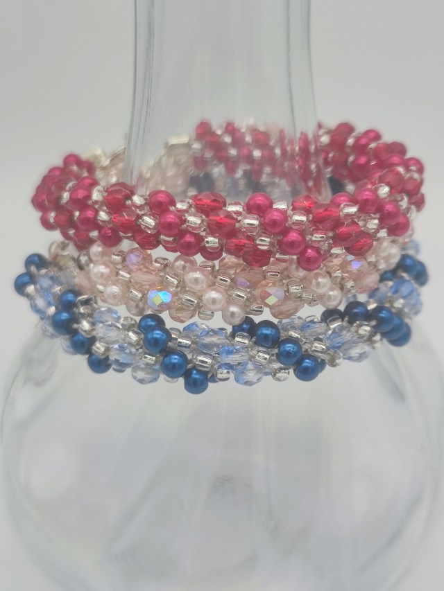 I chose blue for my first bracelet as it’s my favourite colour. My next two were pink and red – pink because I don’t own many pink statement pieces, and red for the versatility. I think the red bracelet could have benefited from a matching seed bead colour but I am still happy with the outcome!
