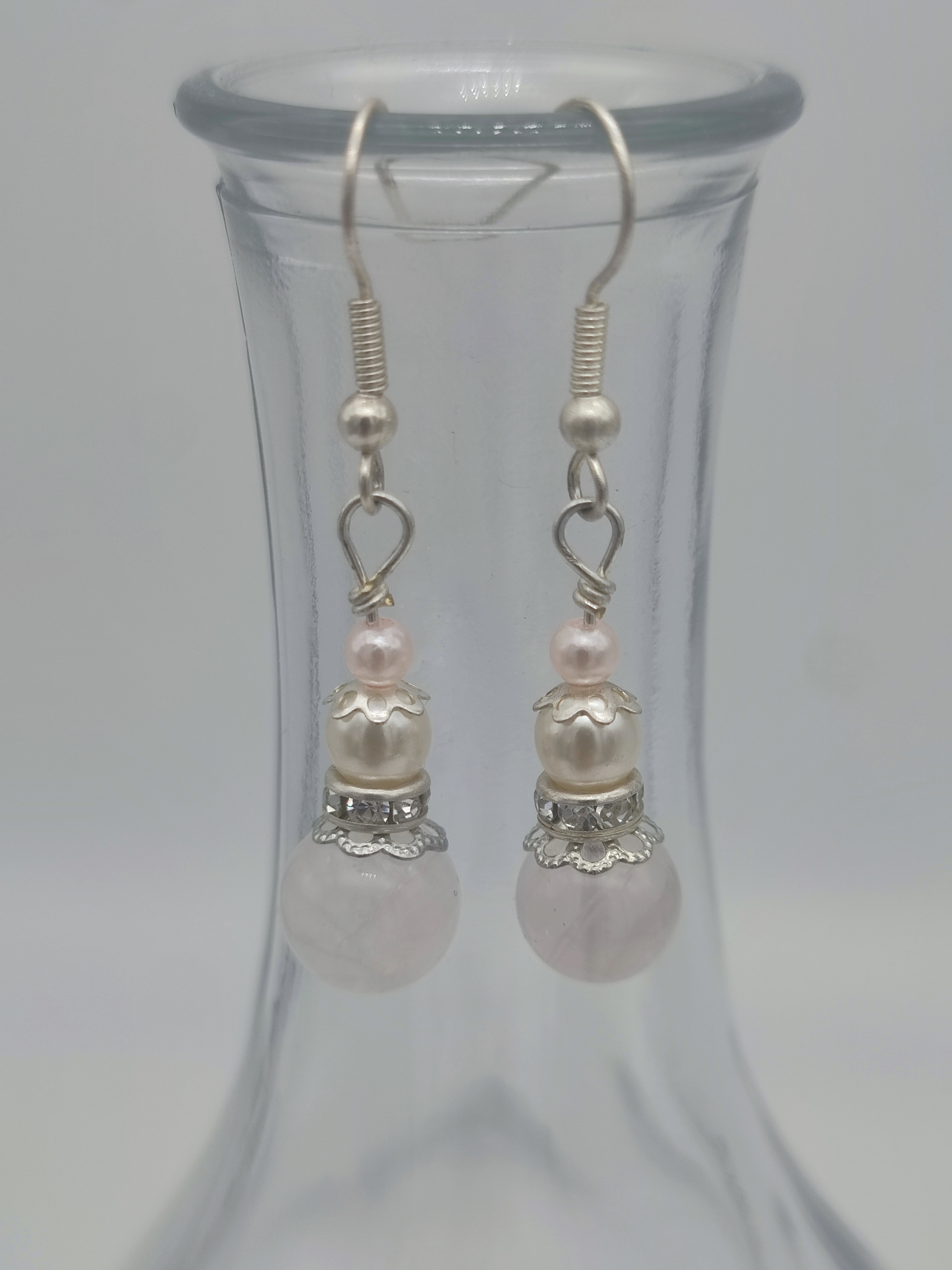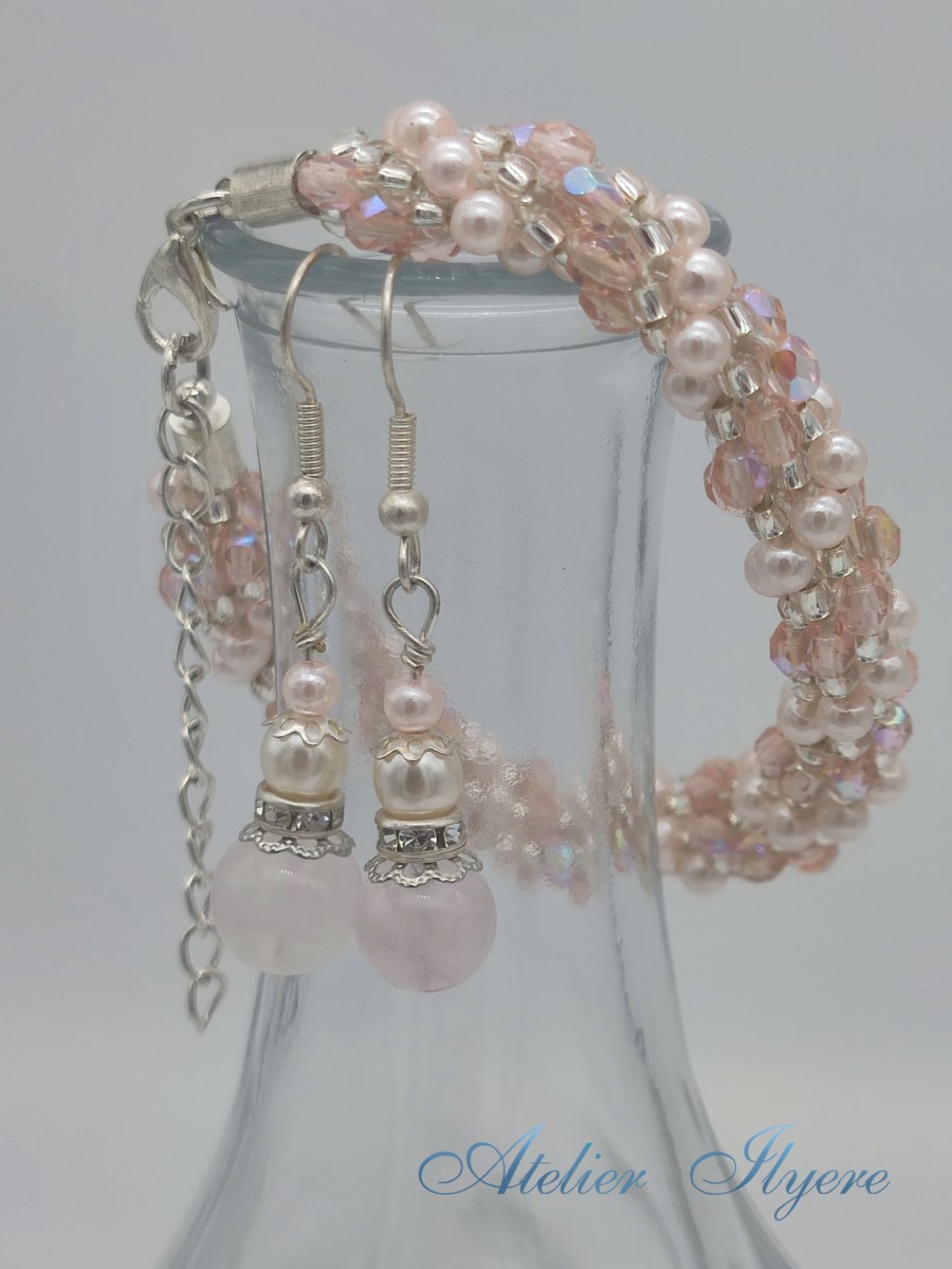I originally was not going to make a new posts for my bracelet colour variations, but a month ago I was attending a wedding and I was planning to wear the pink bracelet with my chosen grey dress. I matched it with a pair of pink earrings made from scratch in less than ten minutes. Jewellery findings like rondelles and filigree caps are incredibly useful to have a healthy stock of! I chose rose quartz beads to sit at the ends and created a nice pair of sparkly drop earrings.