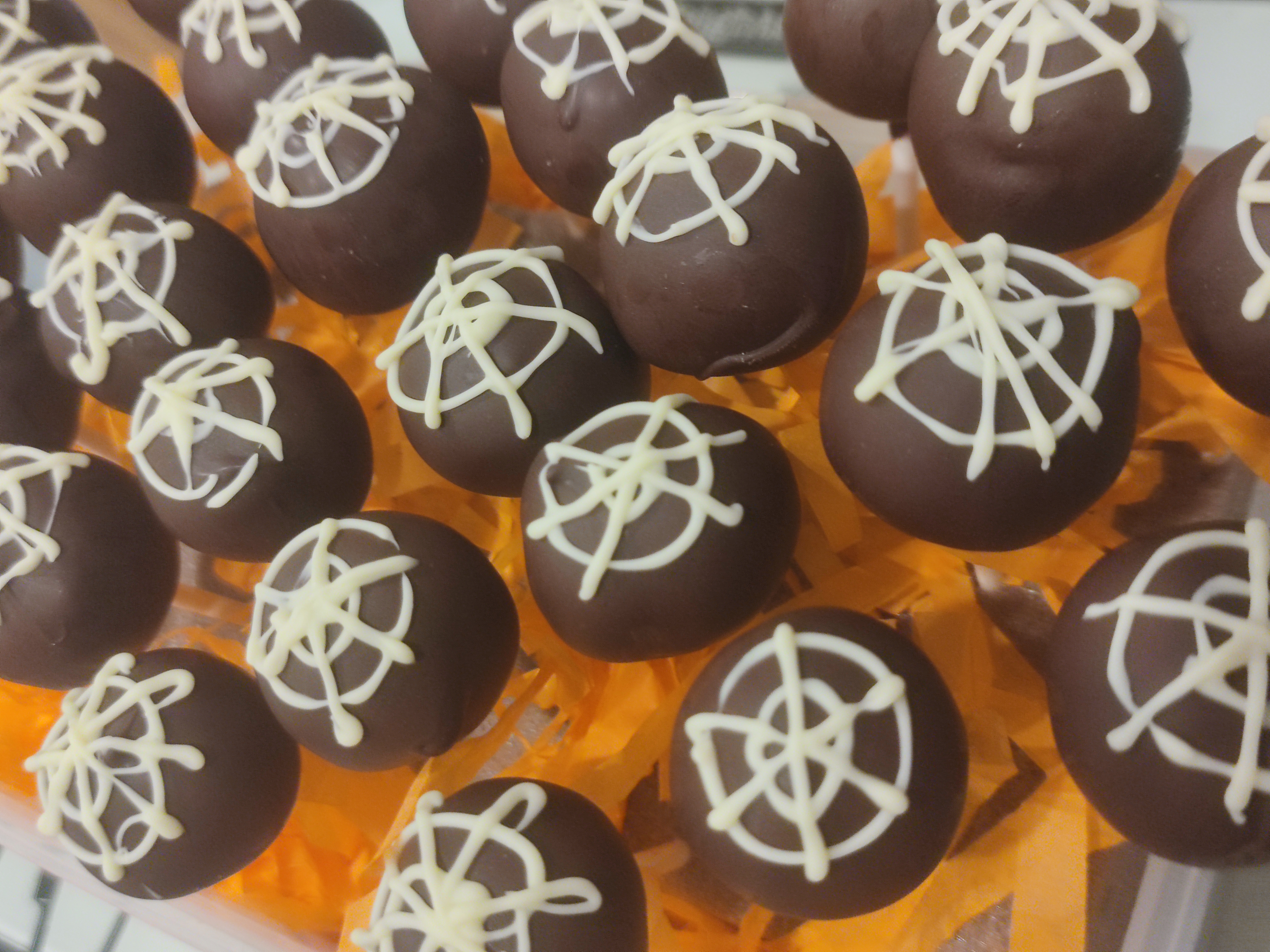 To make the cake pops vaguely Halloween-themed, I piped some chocolate webs onto each pop. This page on Cake Central gives a general idea on how to achieve the shape, but I piped the shape directly to the pops after they had been in the refrigerator for an hour. I melted 200g of white chocolate chips and used an 8in piping bag with the smallest nozzle to achieve the shape. Actually, I think the messiness adds to the overall cobweb look, but maybe that’s me being hopeful!