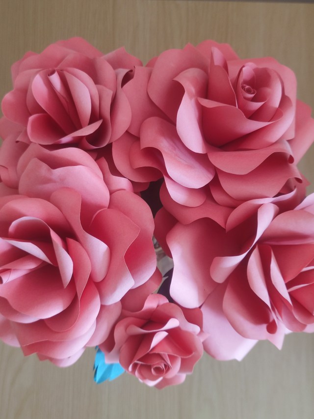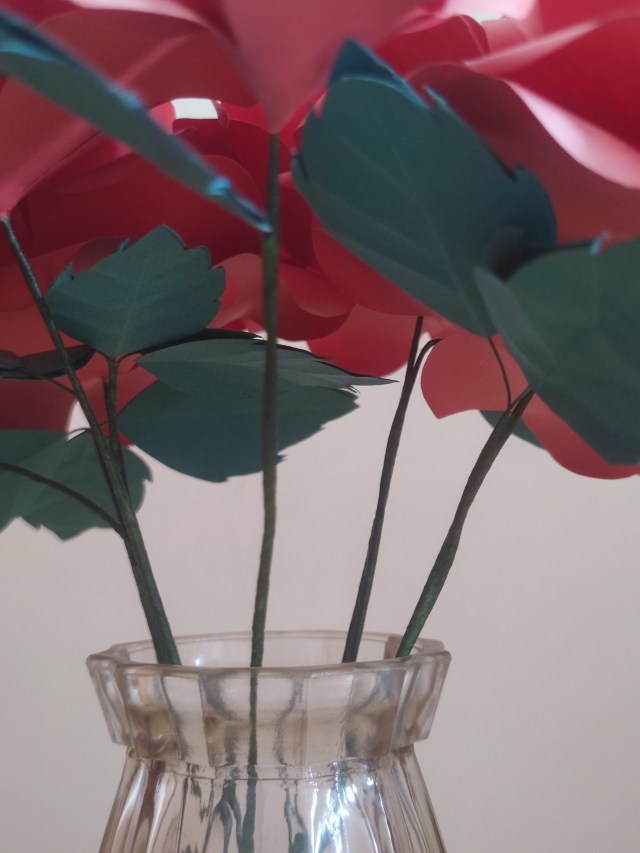 Of course I would make my first vase from red paper, but pink roses are nice too. You also need paper with a nice shade of dark green to form the leaves. I won’t go through the instructions (as you could just buy the book instead!) but the basic process is to roll the single petals together and layer them with the larger petals by size order. Since I fire up the glue gun very infrequently, I try to make up a lot of these in one go!