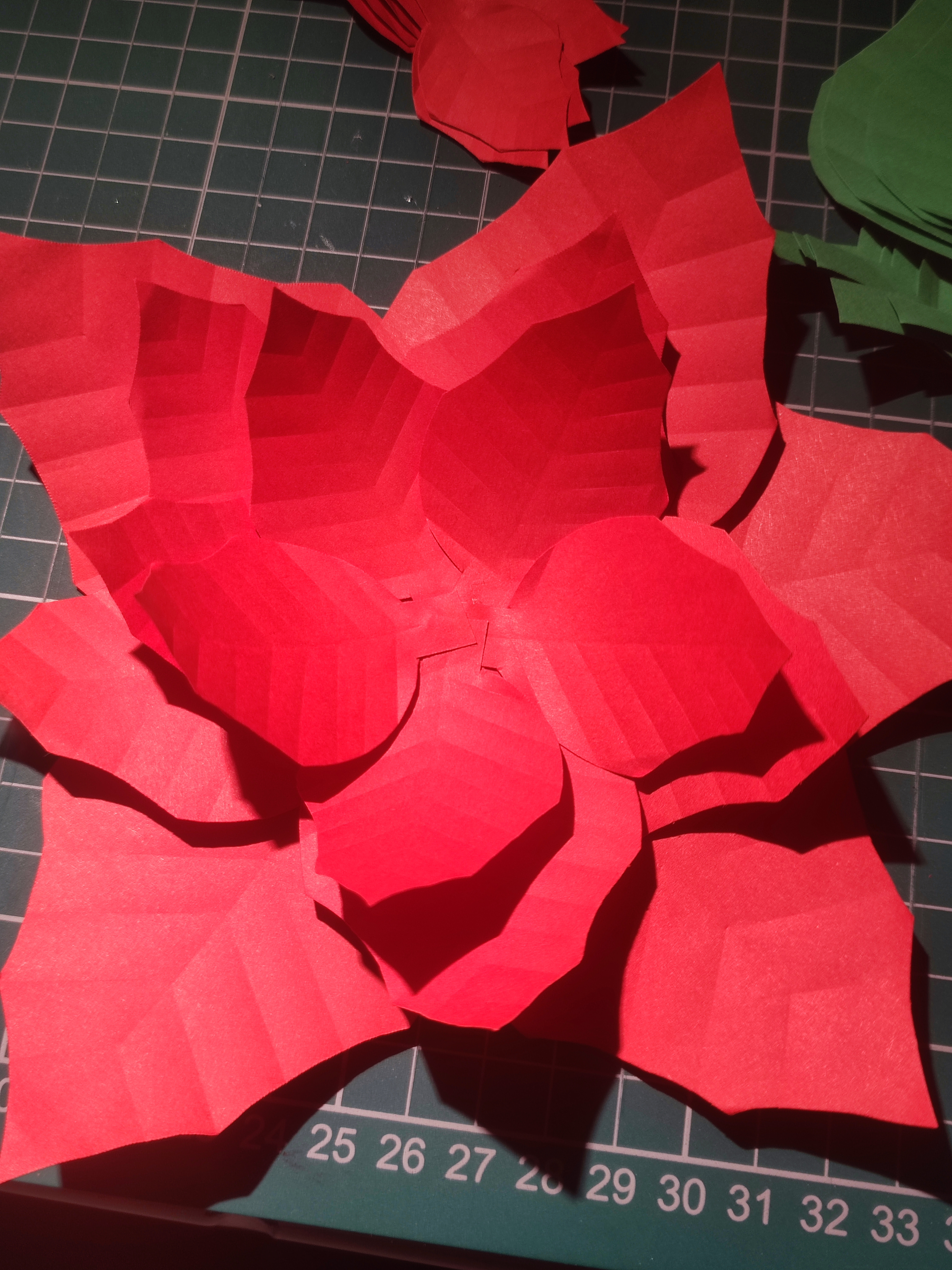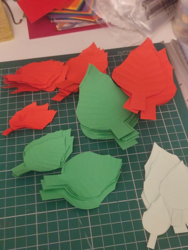 Then I cut out a lot of red and green shapes. Since it’s a star flower, you want five leaves per layer so make sure you cut them out in groups of five, plus spares if you need it. You can add the leaf veins by pressing the edge of a scissor blade into the paper. It can be quite time consuming doing the cutting and pressing but that’s about 80% of the work really!