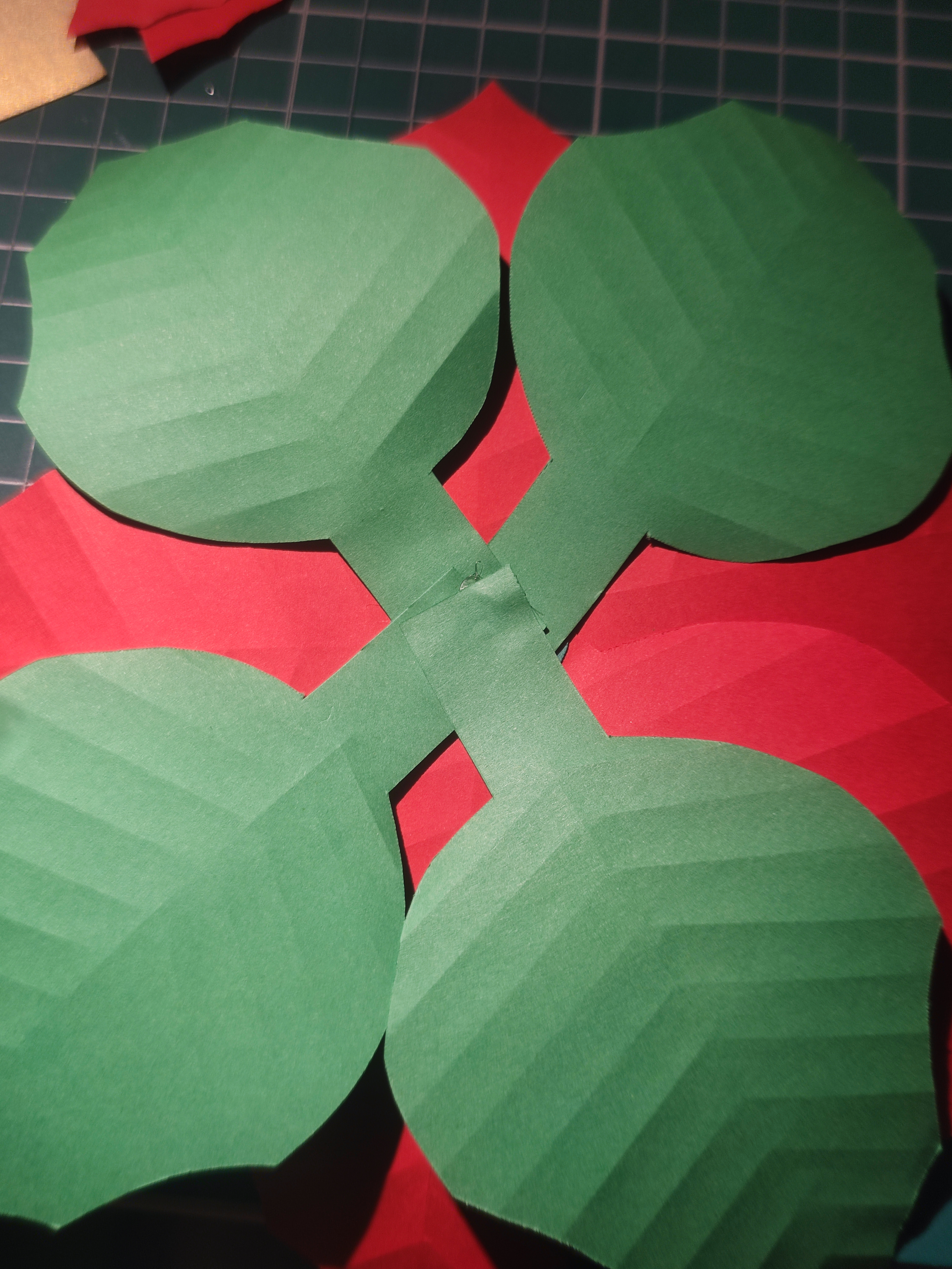 The green leaves can be stuck on afterwards on the back, it doesn’t have to be star-shaped so just add the leaves as you need it or if you need more greenery. Technically I am relying on it not being visible from the back, but there are ways to make this look neater.