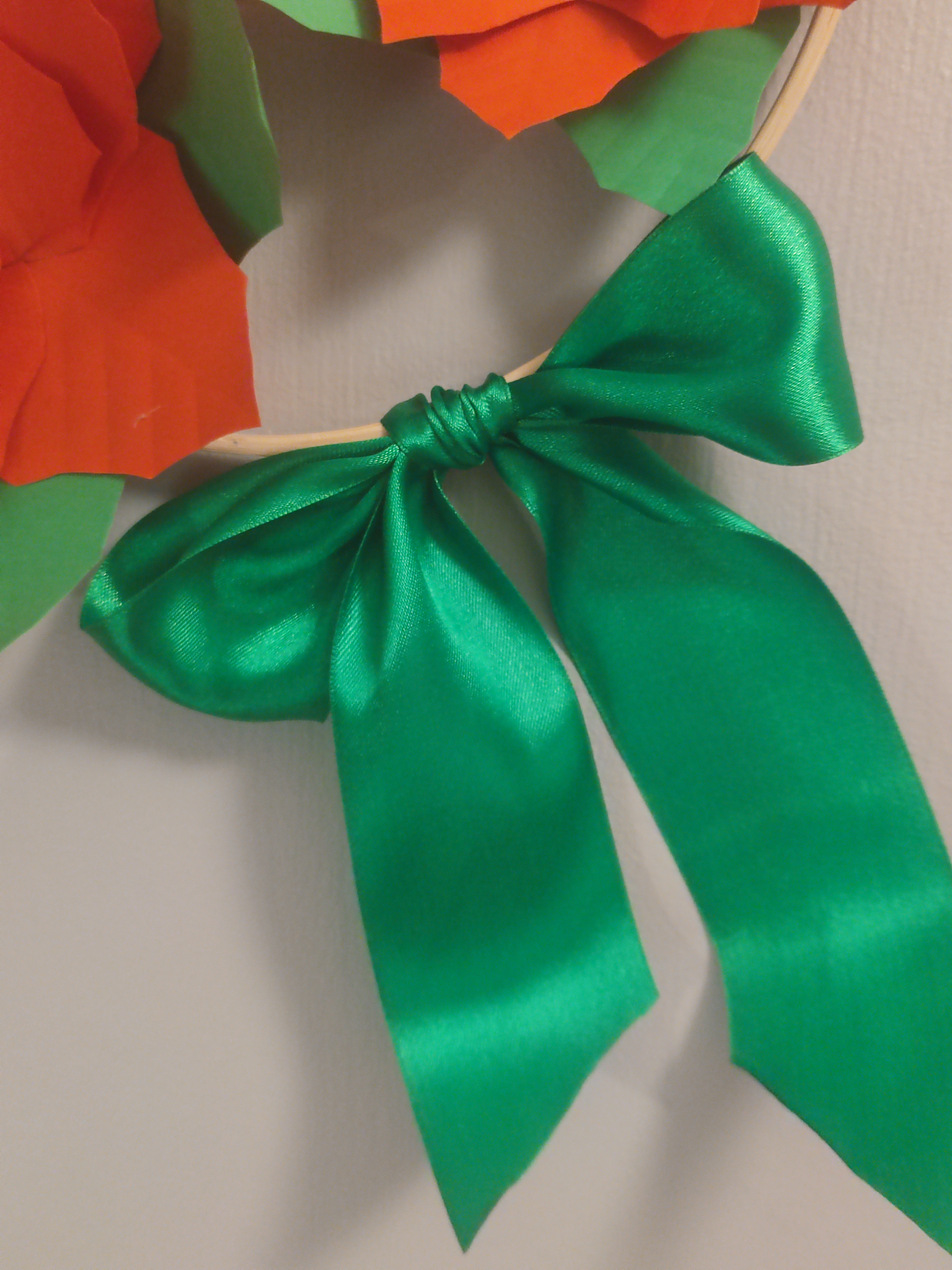 After producing a second smaller floral arrangement, I hot glued the plants to the hoops, on opposite sides of the hoops. There will be a bit of extra space on the hoop, and you can cover this by doing more small arrangements, or just individual leaves lining the hoop like a more traditional wreath where the whole thing is covered up. Instead, I tied an extra large dark green ribbon to it to add another eye-catching part and to make the wreath more balanced.