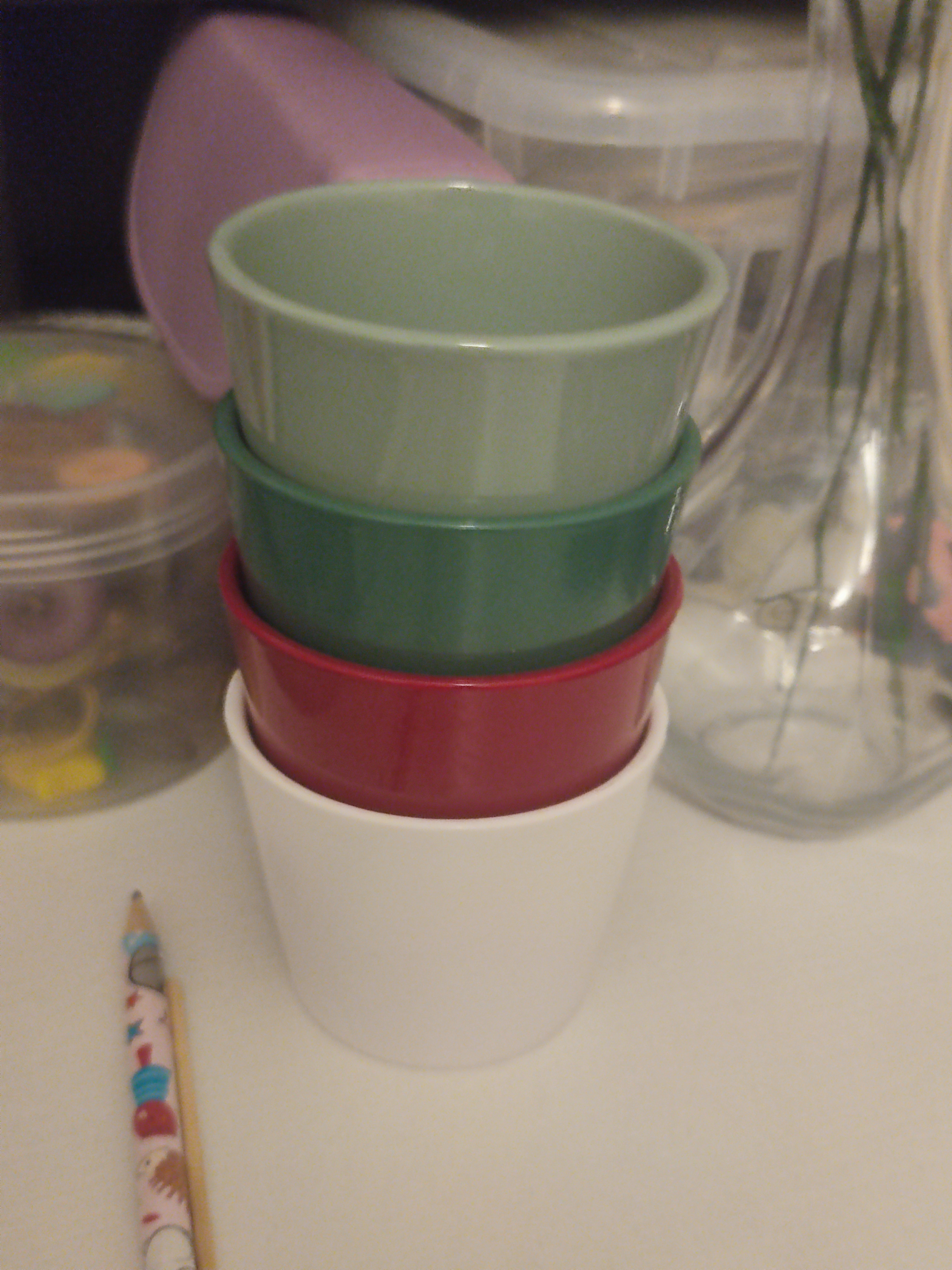 I visited a local garden centre a while back to get some gardening supplies (some bird feed and fish food!) and I spotted a shelf of small ceramic planter pots, of varying sizes. The sizes ranged from a small 3cm diameter to a larger 10cm, so it seems like these pots were intended for indoor use mainly. I ended up buying four 5cm pots as they were only £2.50 each! And they were also the only ones left which happened to be in different colours.