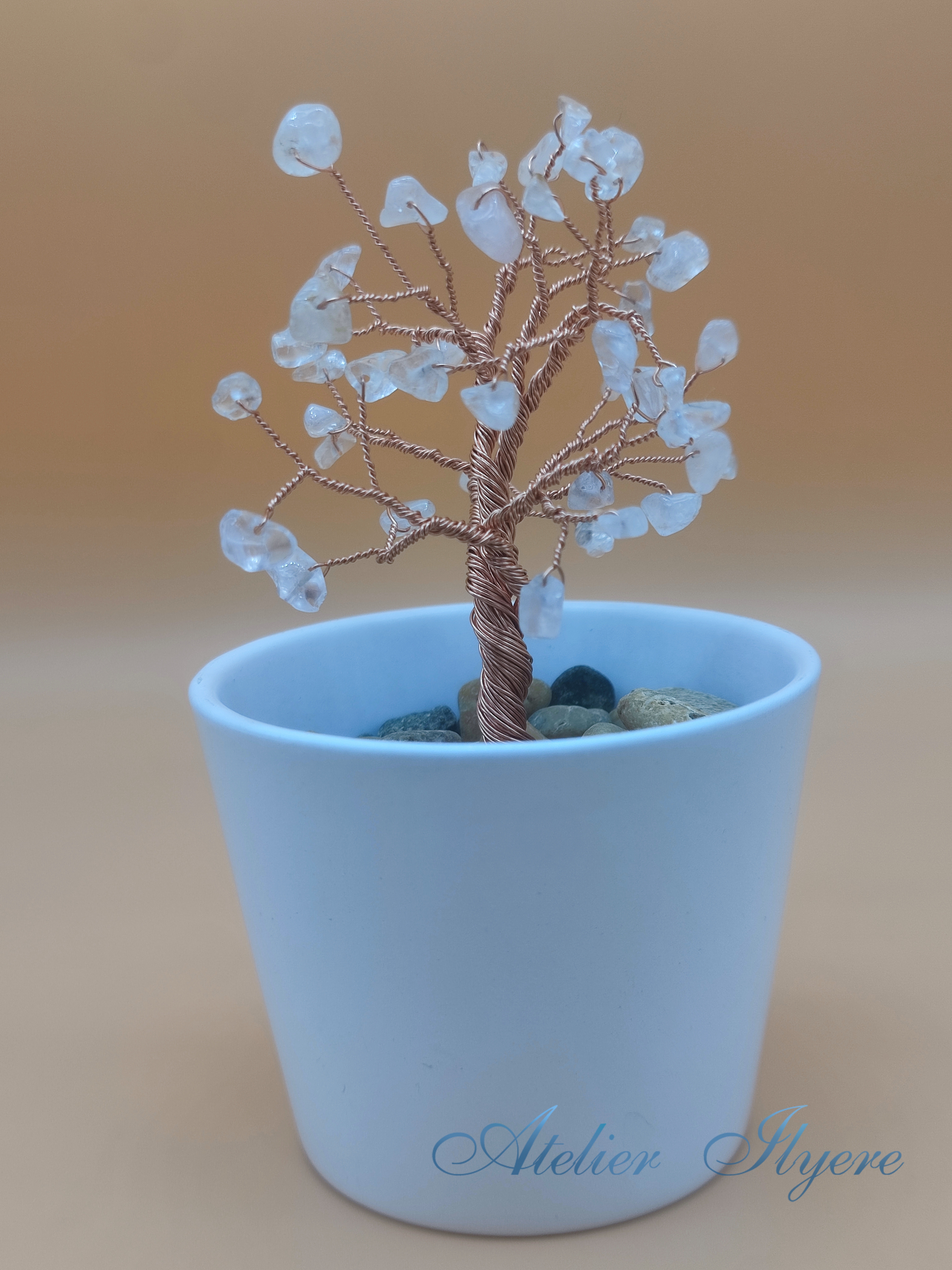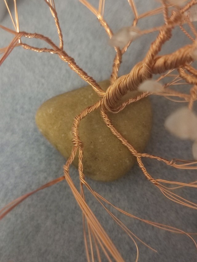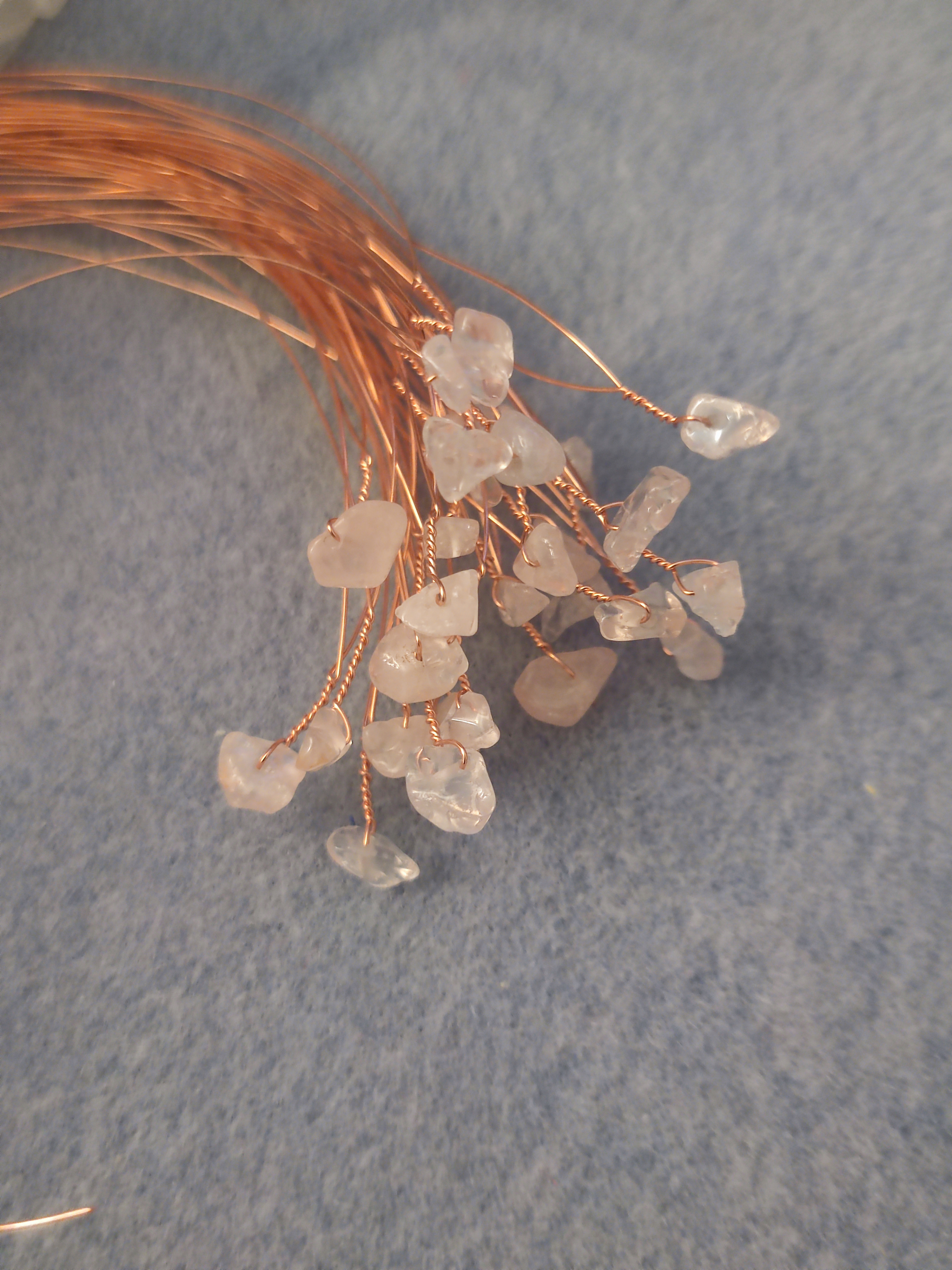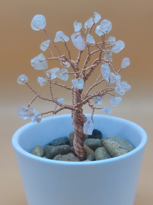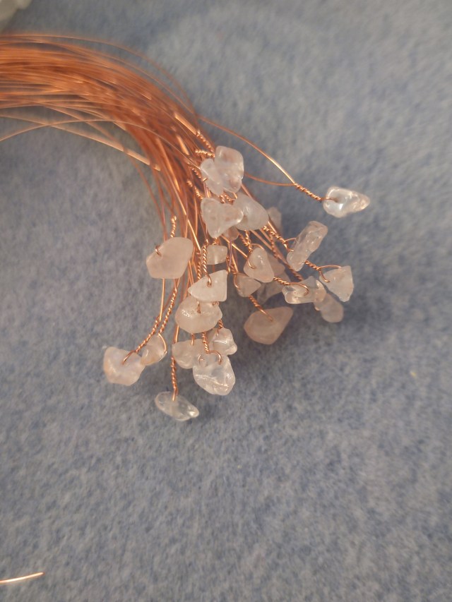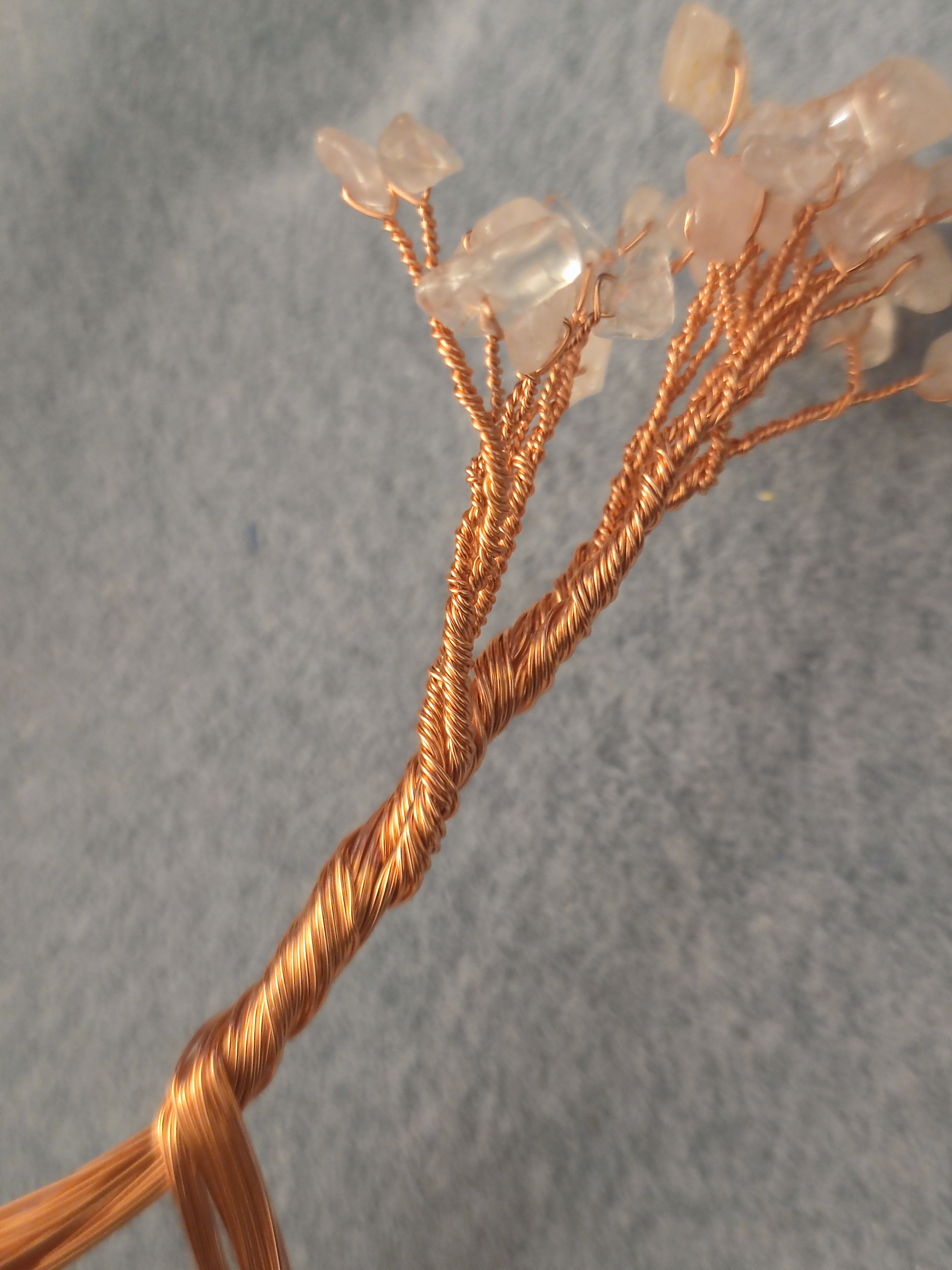 As for the colour combination, I used 0.4mm copper wire as I had the most of it lying around. For the gemstone, I selected rose quartz as it pairs well with copper. In general rose quartz works with most types of wire! If I had more gemstone chips of different colours, I would have tried making a rainbow chakra gem tree but I was missing red and blue chips. An idea for the future!