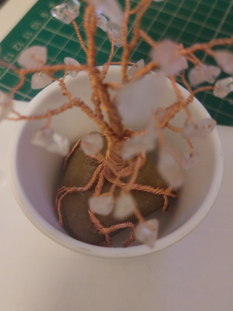 So as I mentioned before, I was following the tutorial but adjusting the size and quantities. I cut lengths of 40cm copper wire and twisted on about 30 gemstone chips. 40cm is a lot more wire than I needed, but it is better to measure over and then trim as required. I also learnt that using one wire per chip is ideal as it will help form thicker branches and a sturdy trunk.