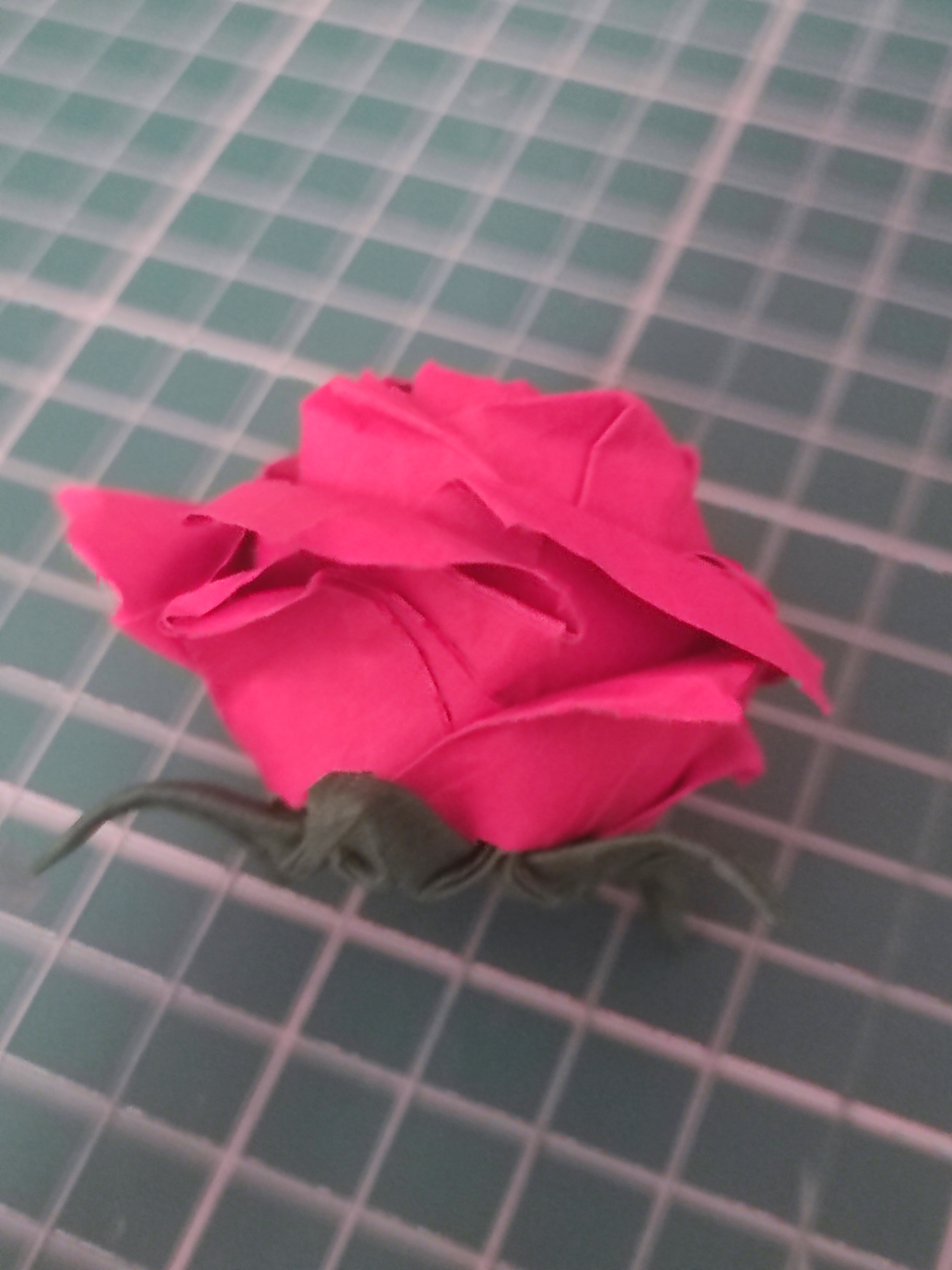 When cut to the right size (I used a 10cm square, half the size of my rose) and folded precisely, it is a perfect fit! The dark green paper that I used in the end was of a higher gsm (normal A4 tends to be around 70-80gsm), which did make the folding more difficult. I always seem to have difficulty finding dark green paper in stores so I didn’t have much choice in this matter, but I’m glad it worked out.