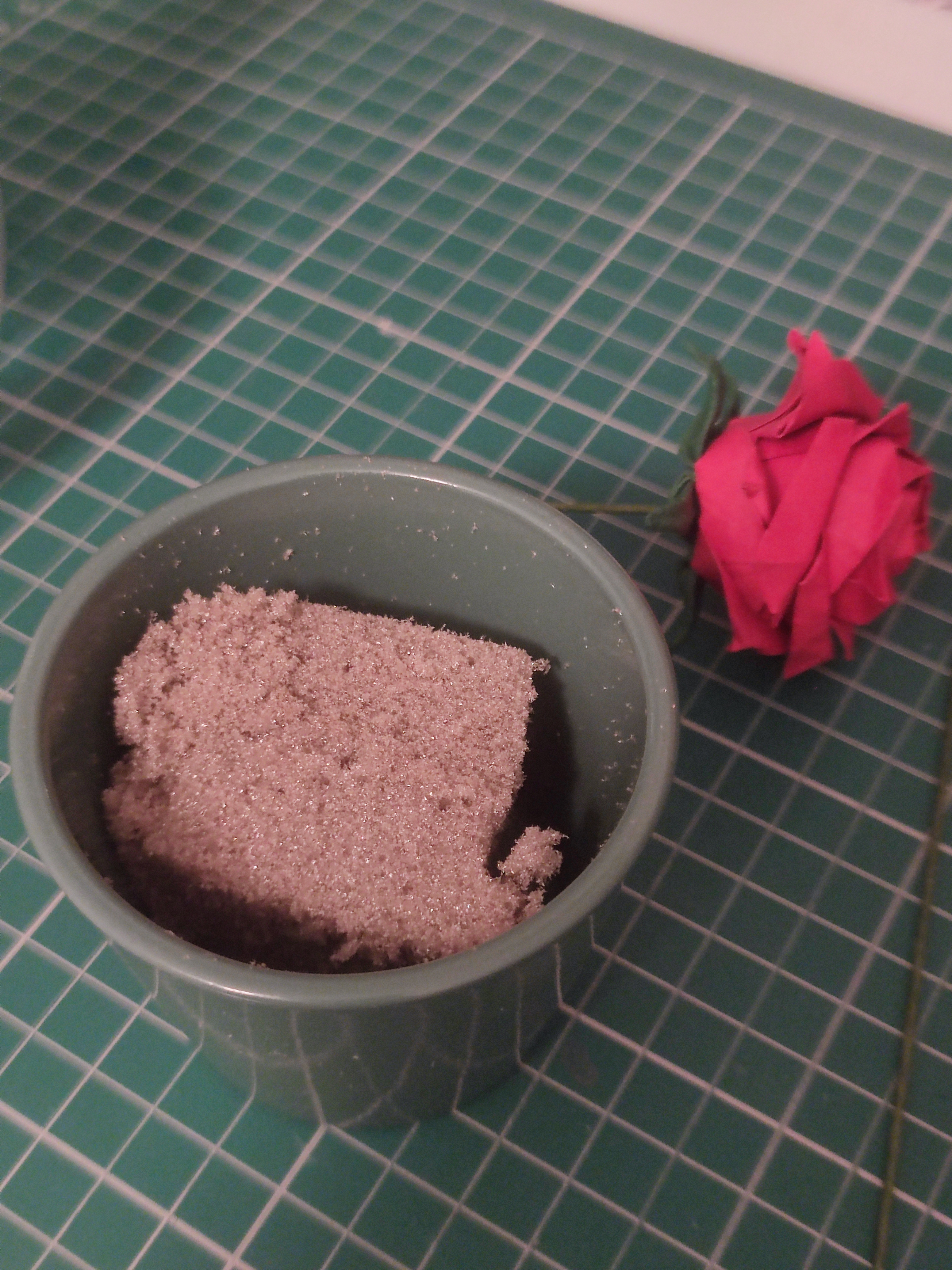 Now, the matter of displaying the rose in the pot. I cut a small block of oasis foam and placed it freely in the pot. It doesn’t matter how it looked because I planned to cover it up, but it won’t be secure. I then hot glued a sugarcraft stem to the centre of the rose to hold it up and secure it in the block.