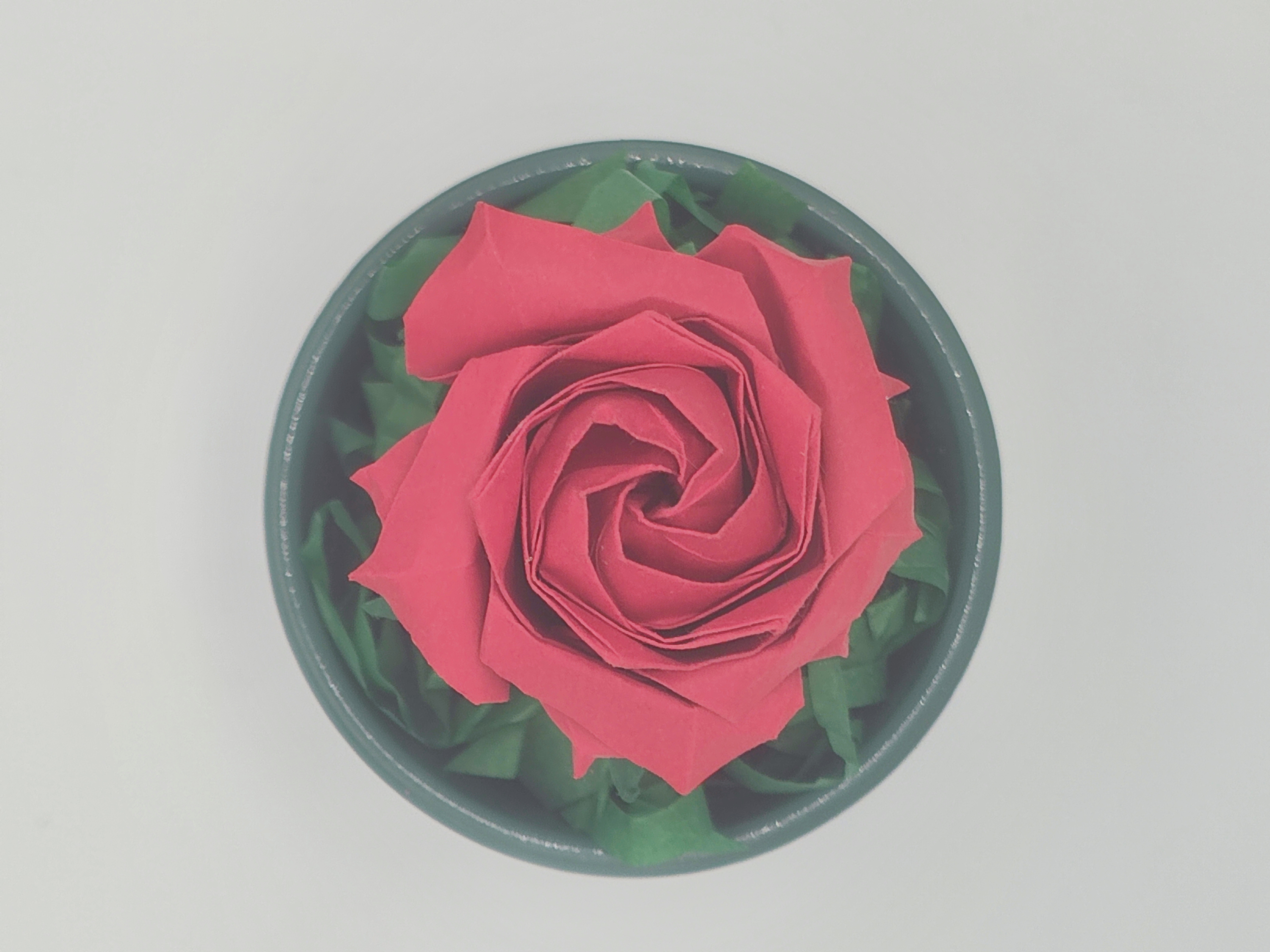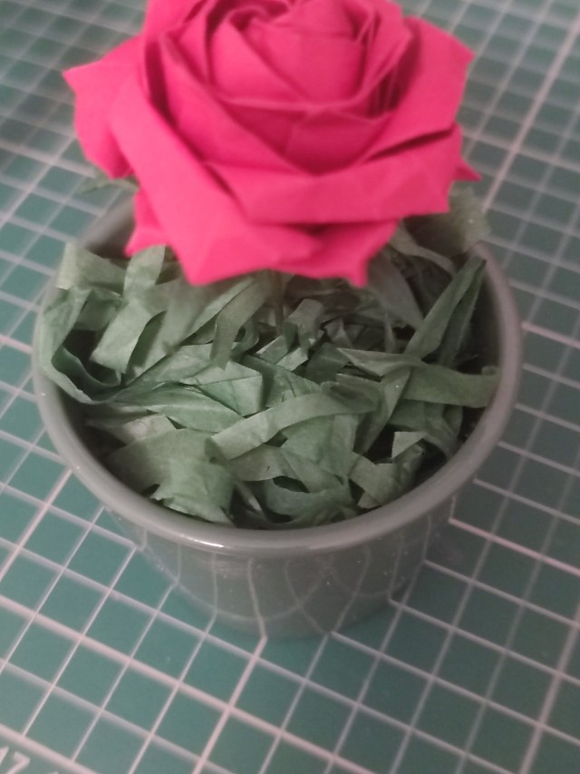 You also have the option to add a calyx to the rose, if desired. I was planning on making a single rose for my planter pot, so I thought it should have one. There is a follow-up tutorial to make a calyx, also by Tadashi Mori which fits the rose perfectly. I did try making this a couple of times too, as I wasn’t sure if I should use the light green thinner paper, or the darker green thicker paper. Again the outcome varied in quality as it is so easy to make mistakes.