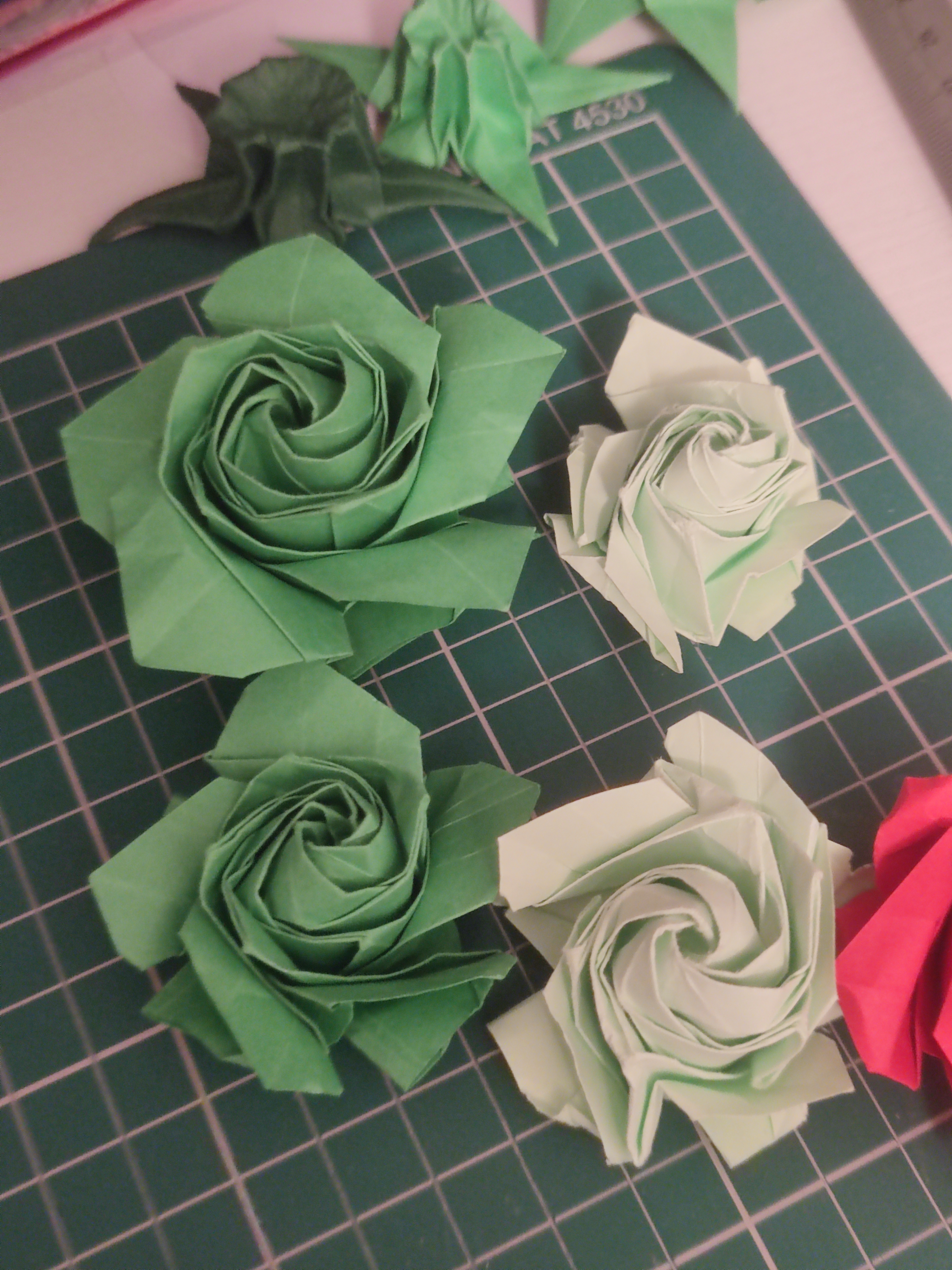 This time I followed the video tutorial on YouTube by Tadashi Mori. I linked a different tutorial in that post but I did some searching for a more up-to-date tutorial and the quality of this video is much more clearer, so I would recommend following this one if you want to learn! It is a bit difficult so only attempt it if you are intermediate-level in your folding skills. I am certainly more skilled now, but since I was a bit rusty, I practiced on some spare green paper. I always have a lot of it – it is not a popular colour for flowers, as you can imagine! I’m glad I did a few test runs because the quality of each one really did vary. I also cut out my own squares/pentagons to test different sizes for my desk pot.