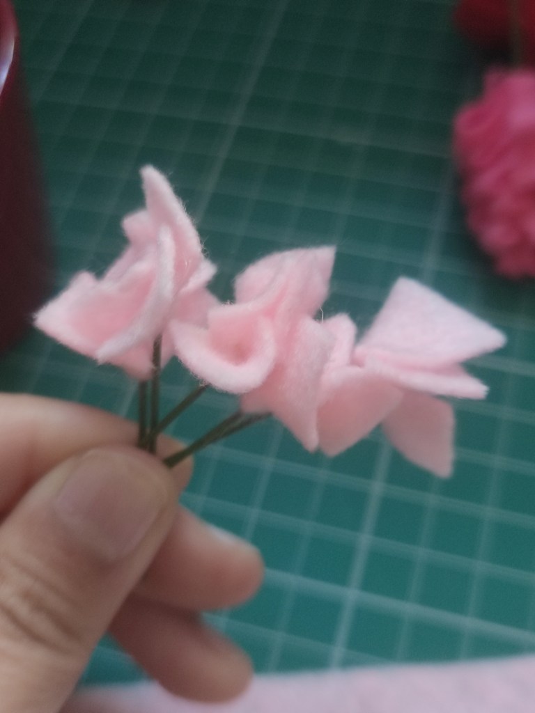 Next, I was reading this felt flower tutorial on wikiHow and idea #5 show how to make a hydrangea. When I look at hydrangeas, they are a bit more square-shaped, so I cut out squares and made little cuts for the petals. I poked a hole using a sewing pin and put a wire through, then I applied hot glue to the centre and pressed the felt against the centre. Individually it may not look impressive, so I made five stems total to represent a hydrangea a bit more closely.