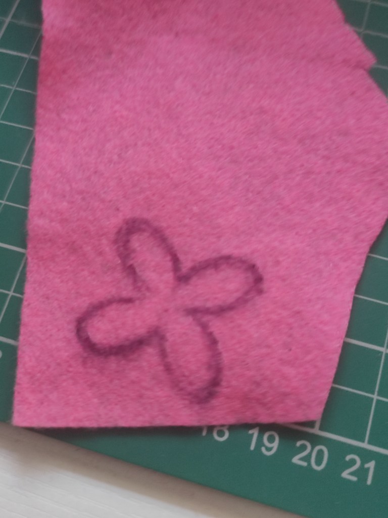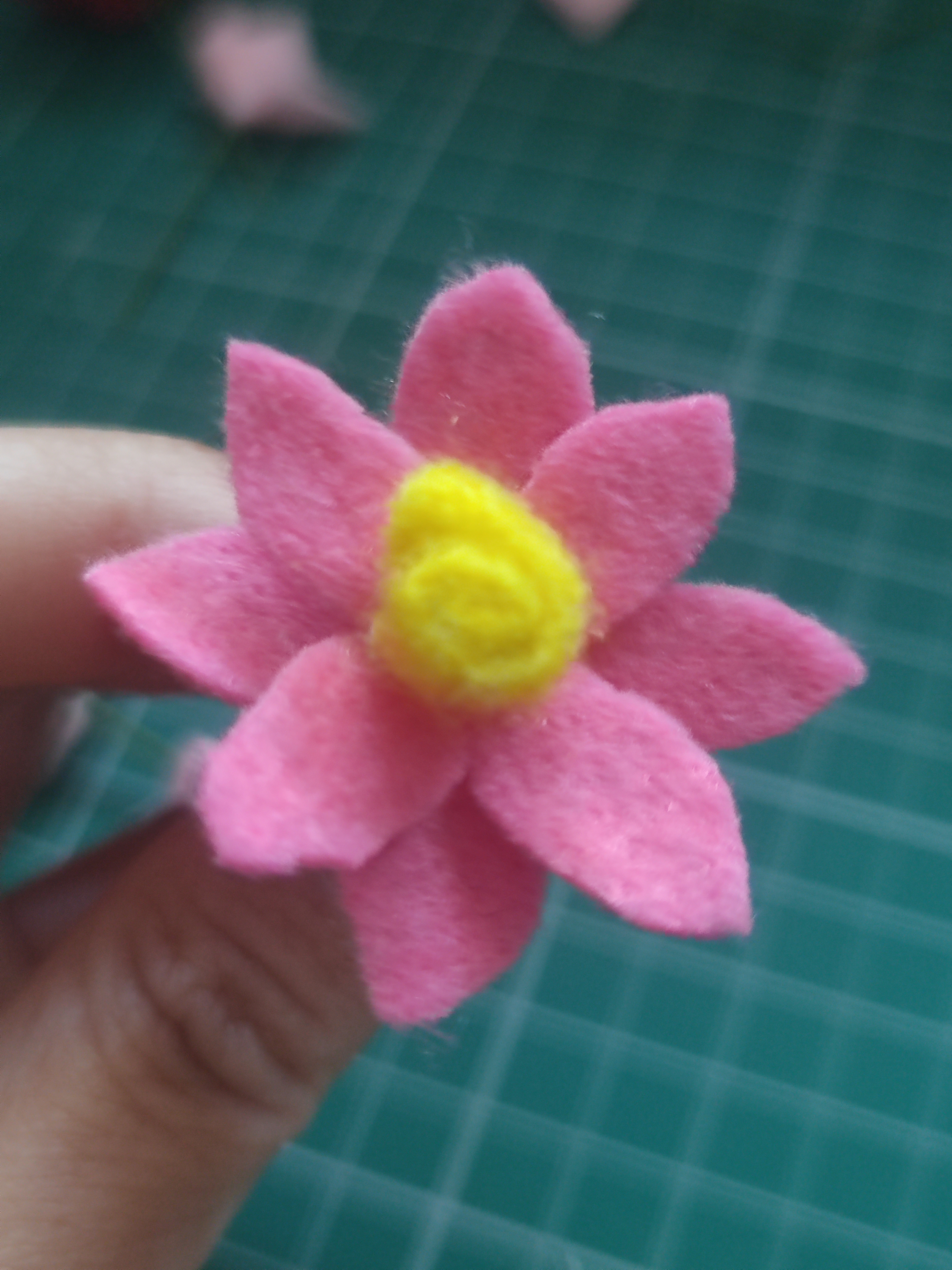 For one flower, I did some freehand petal cutting and made two layers to stick together. Unfortunately pencil does not work well on felt so you have to use an ink pen if you want to draw a template, and you definitely want to draw a larger shape than you need so that you can cut away the pen lines. I also rolled up a small bit of yellow felt to hide the floral wire, although I cut it quite big for the size of the flower!