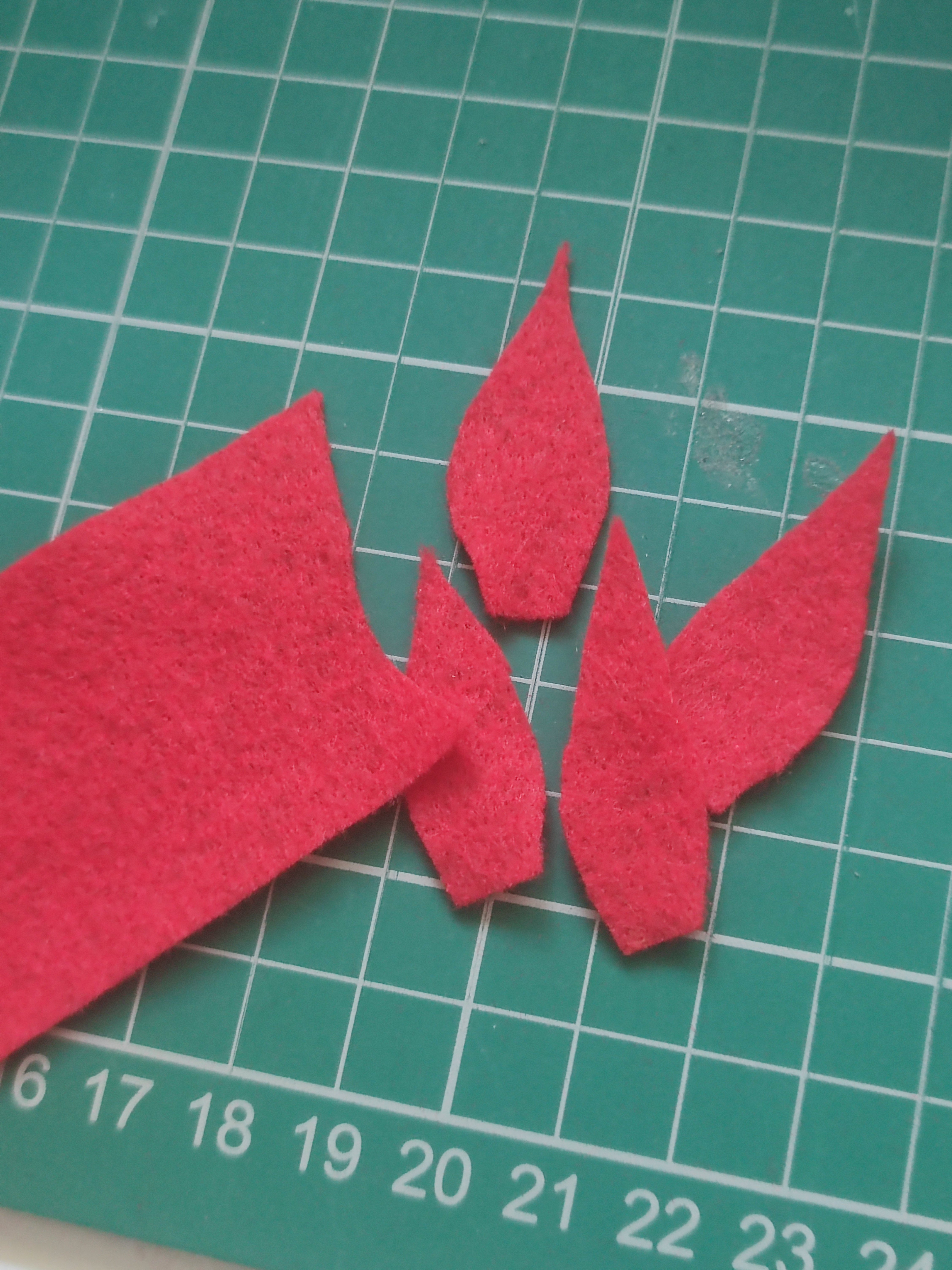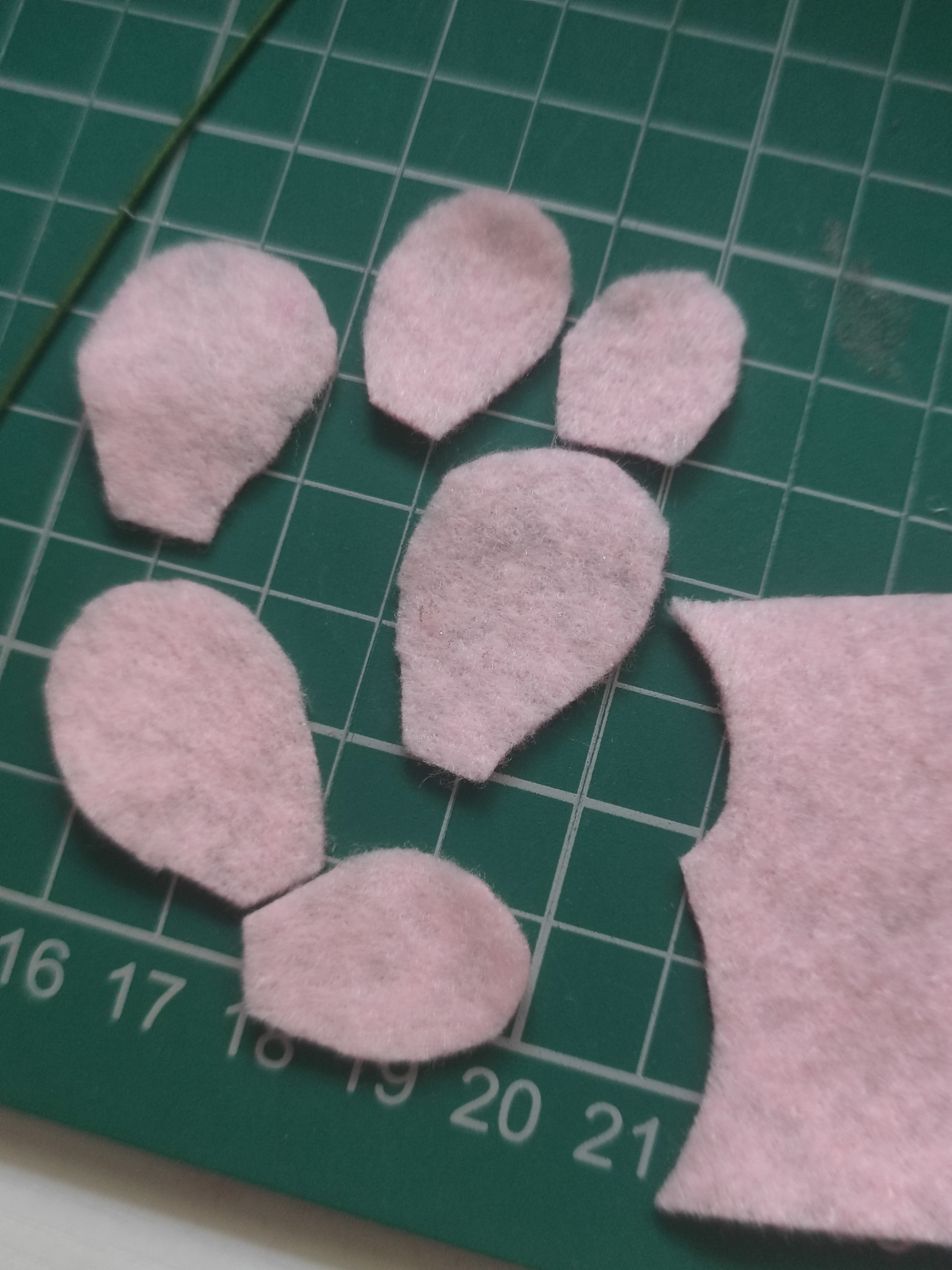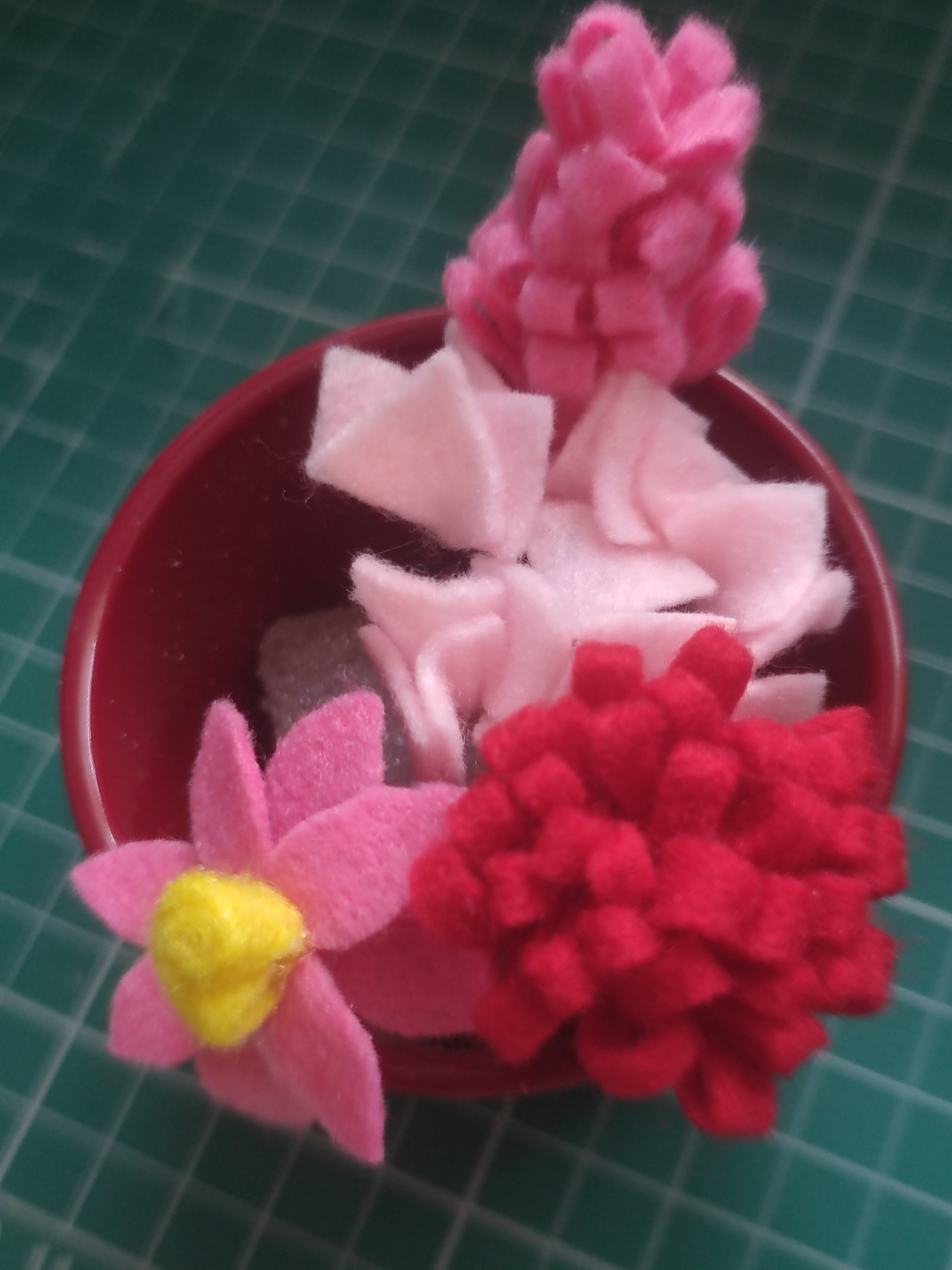 I wanted to make a felt flower pot with colours that matched my last red pot, so I pulled out the red and pink sheets and any spare offcuts of felt that could work. I also have some dark green with I could use to make the leaves, but I have seen that it might not work with the generally lighter colour scheme. I also thought maybe I could find some use for yellow but it could clash with the other colours. Sometimes my ideas run a bit crazy and I just get everything out of the drawer to begin with!