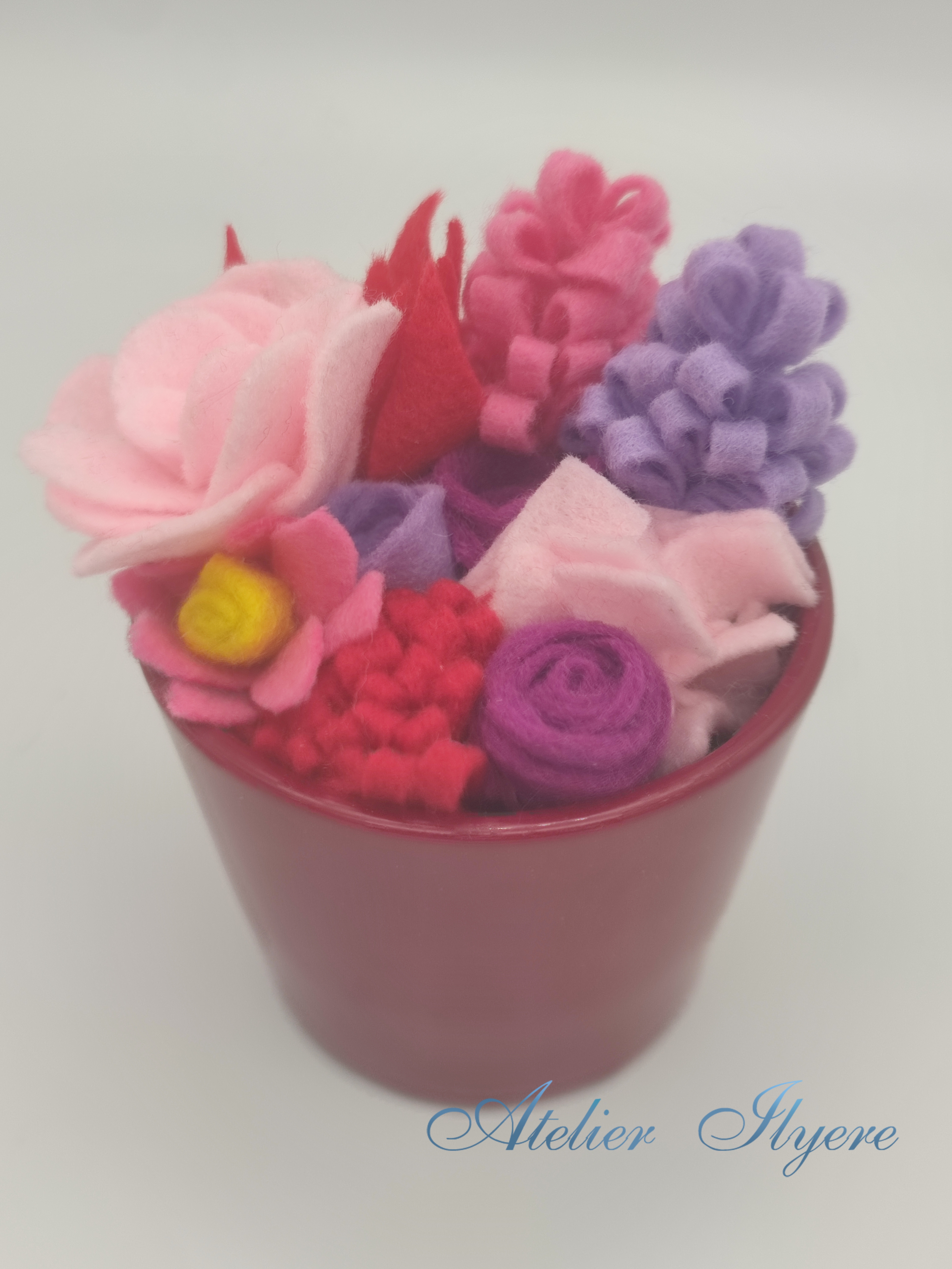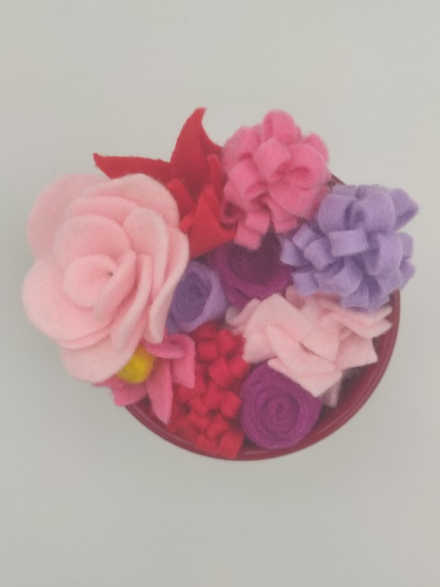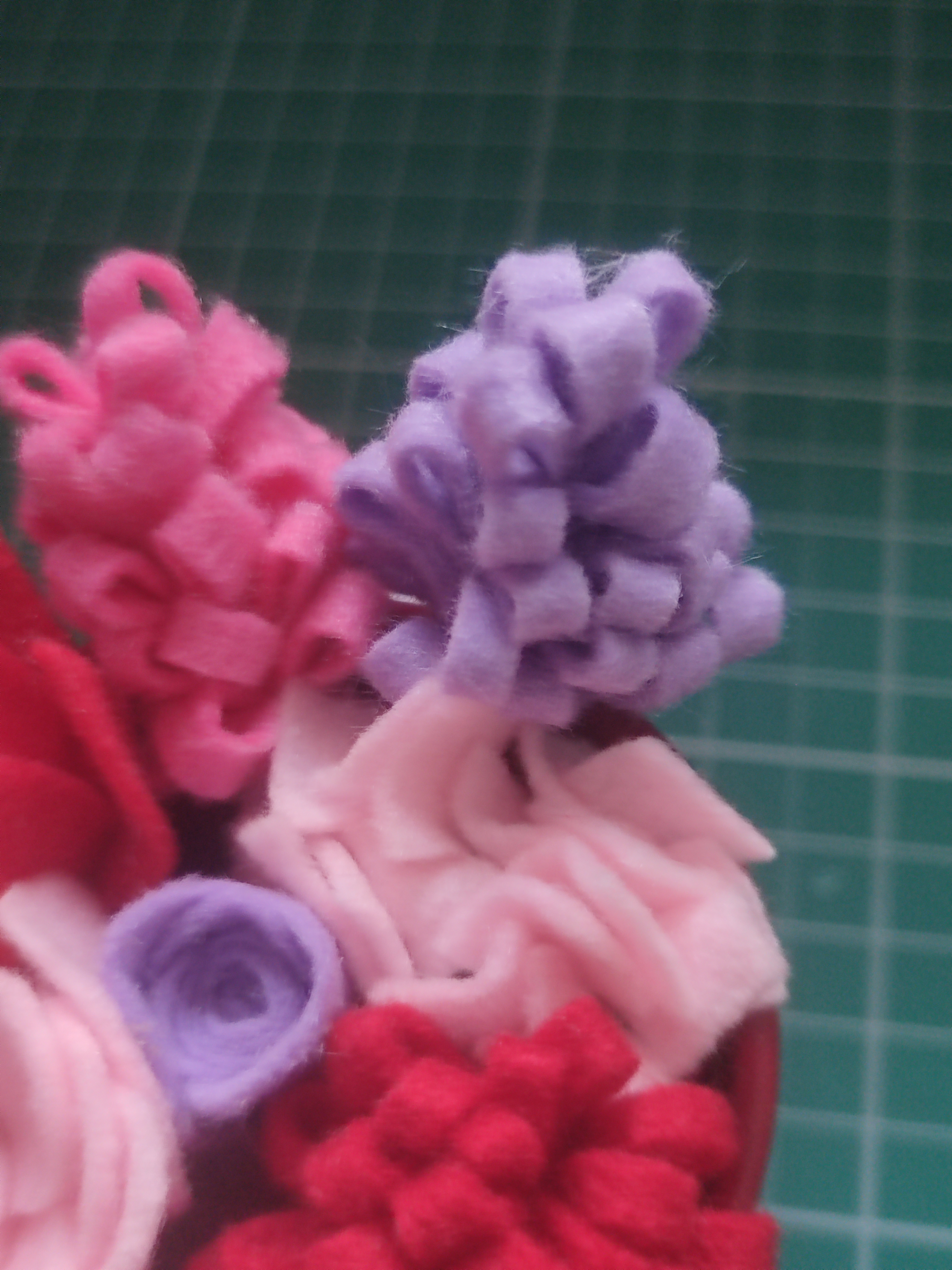 At this point I started to go a bit more freeform and created a lot more flowers. I made a light pink flower from doing the same thing I did with the poinsettia, but with rounded petals to make it look more rose-like. I grabbed some extra purple felt sheets to add some more colour to the pot and made another lavender stem. Then I cut off some strips of felt and just rolled them up to make rosebuds for the smaller gaps.