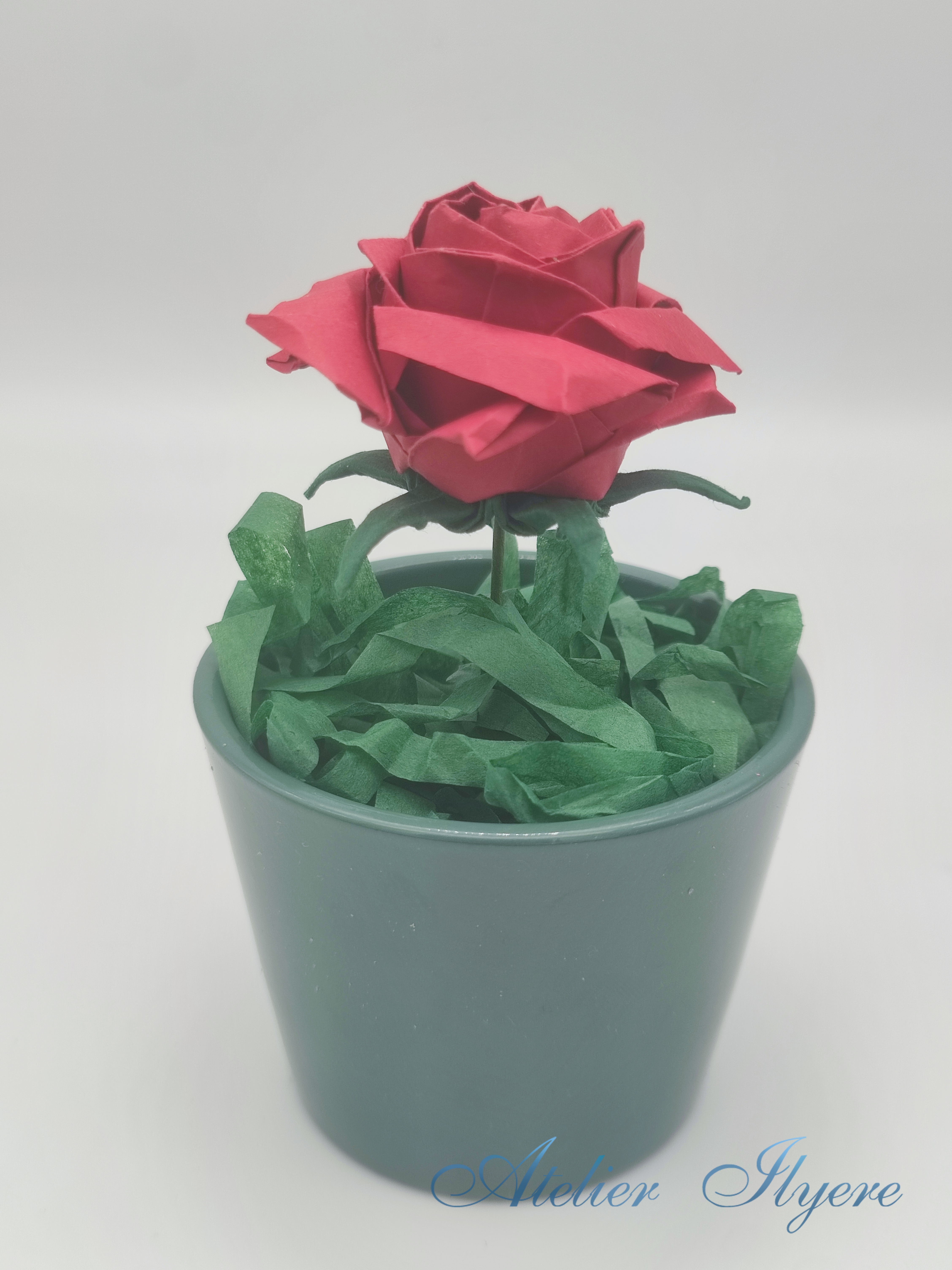I had most of what I needed already to make this, but I had to find a nice sheet of A4 dark green paper to make the calyx. I always seem to be short of good green colours! It doesn’t take long to assemble really, but my bin was filled with various misshaped pentagon roses that I was practicing the pattern on. Since I was only using one rose, it just had to be folded perfectly!