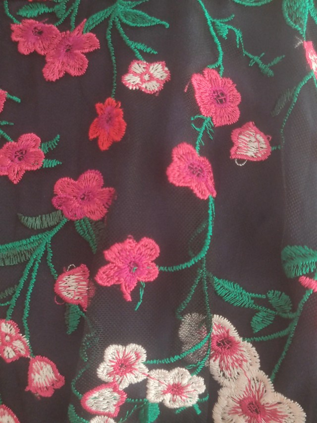 I bought this lovely navy dress with embroidered floral detail. The pattern was a mix of bright hot pink flowers, light pink flowers, and some red flowers, with dark green leaves and stems throughout. A sample of the pattern is pictured below!