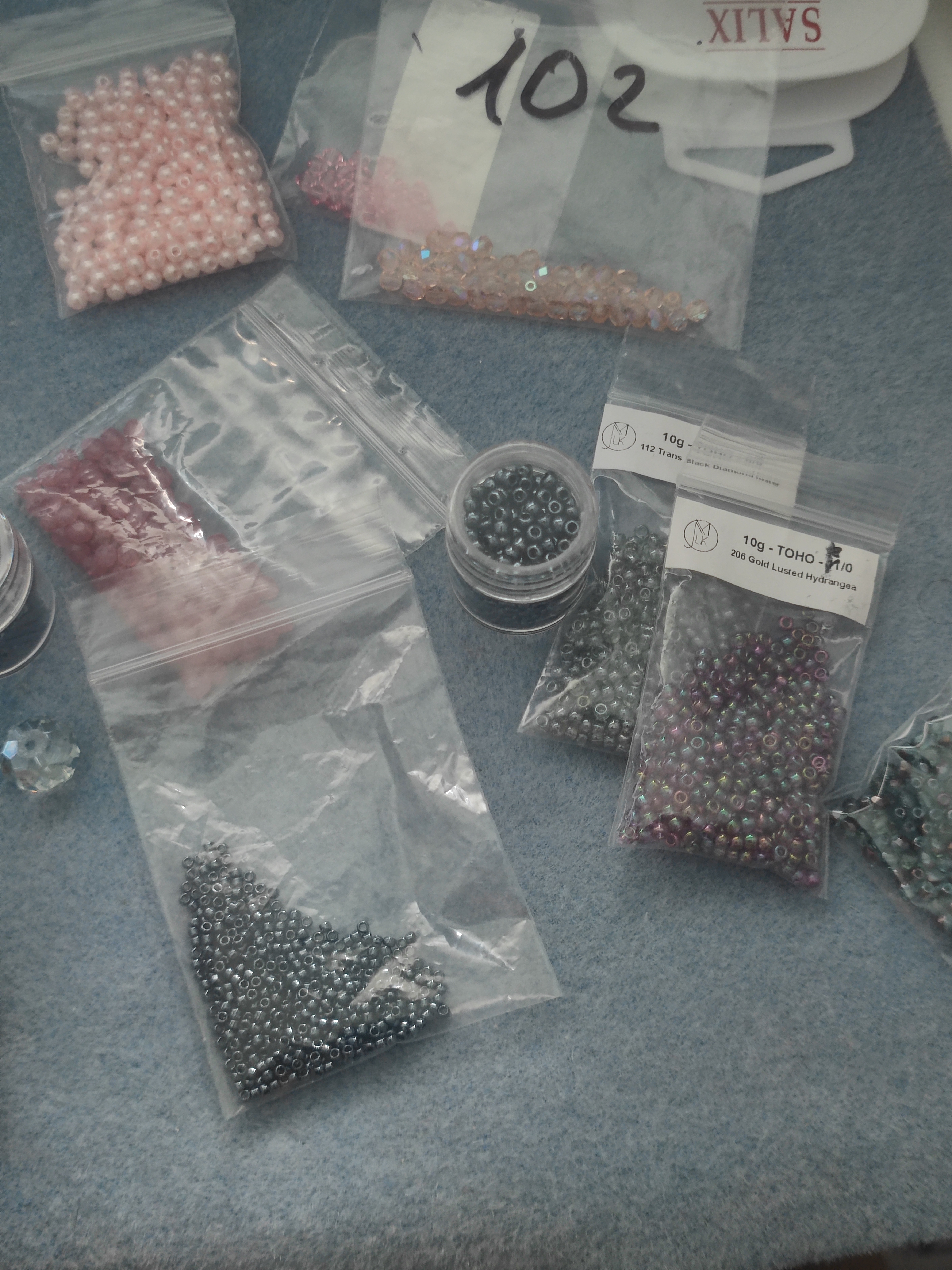 That just left the accessories! I wanted to match the colour scheme of the floral design. I pulled out everything I had that could work with what I wanted. Glass pearls, fire-polished beads, seed beads – I own a lot of beads but I had to figure out a way to tie them all together!