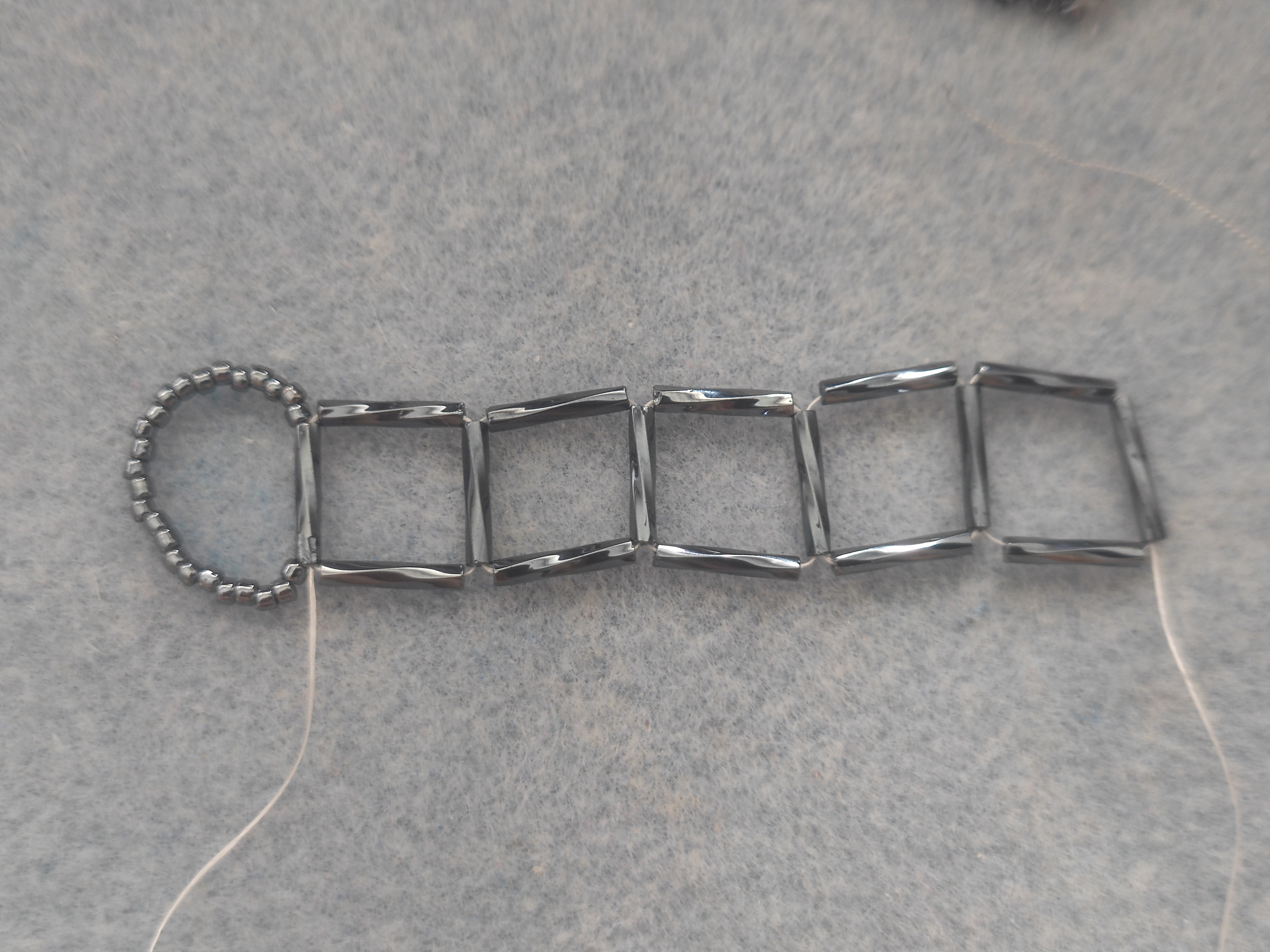 So as is usual fare with me, the beads I used are never the same sizes as what is recommended. I own a lot of different things, but never the exact thing that I need! The pictured project used 6mm bugle beads, however I only had 10mm twisted bugle beads. There were a shiny black colour, so I really wanted to make this work. Right-angle weave stitch is very modular as you just have to run the beading thread through groups of four bugle beads to secure everything in place. It might not look perfectly square but with enough runs of the beading thread up and down the bracelet, it will correct itself later.