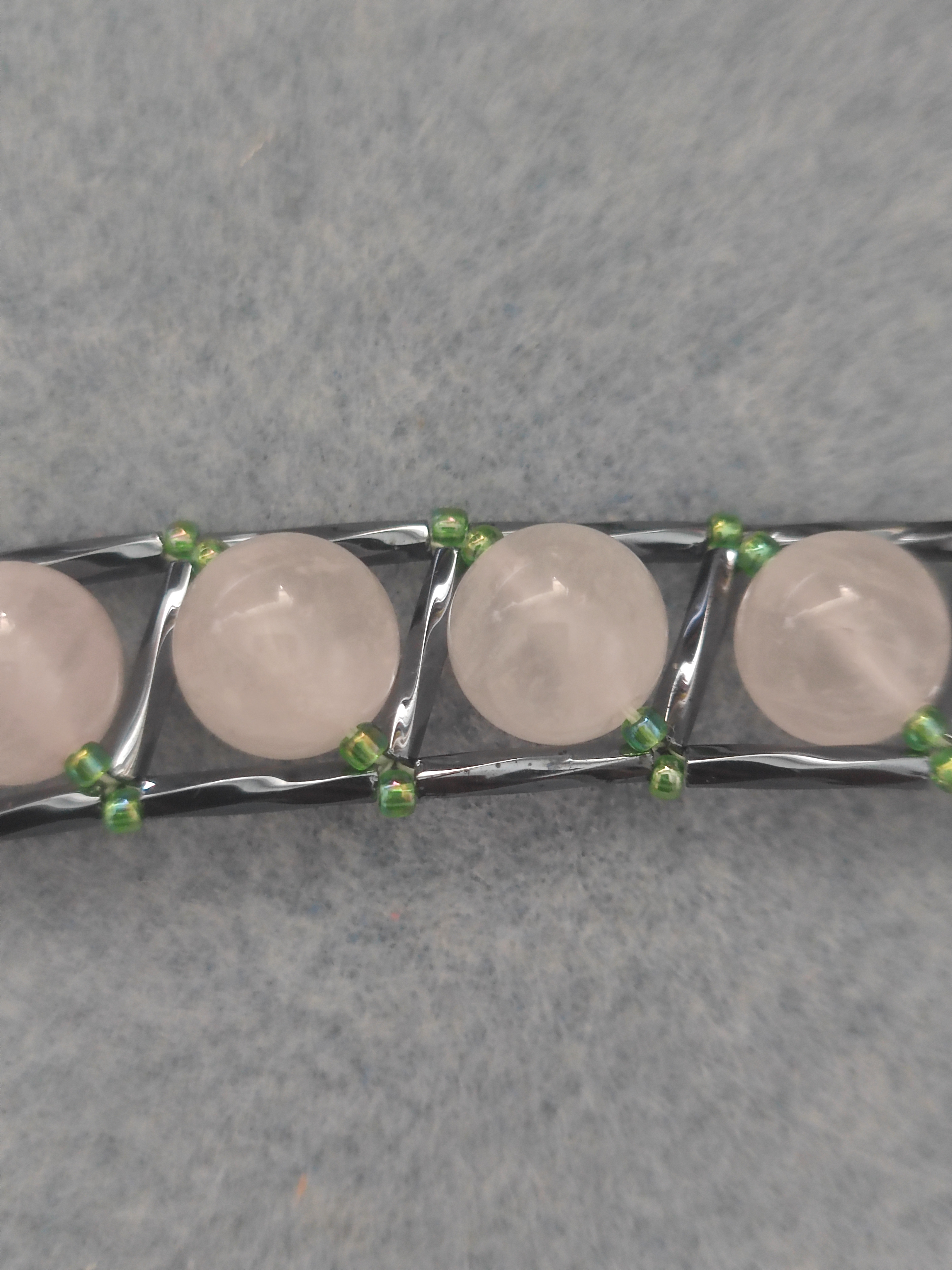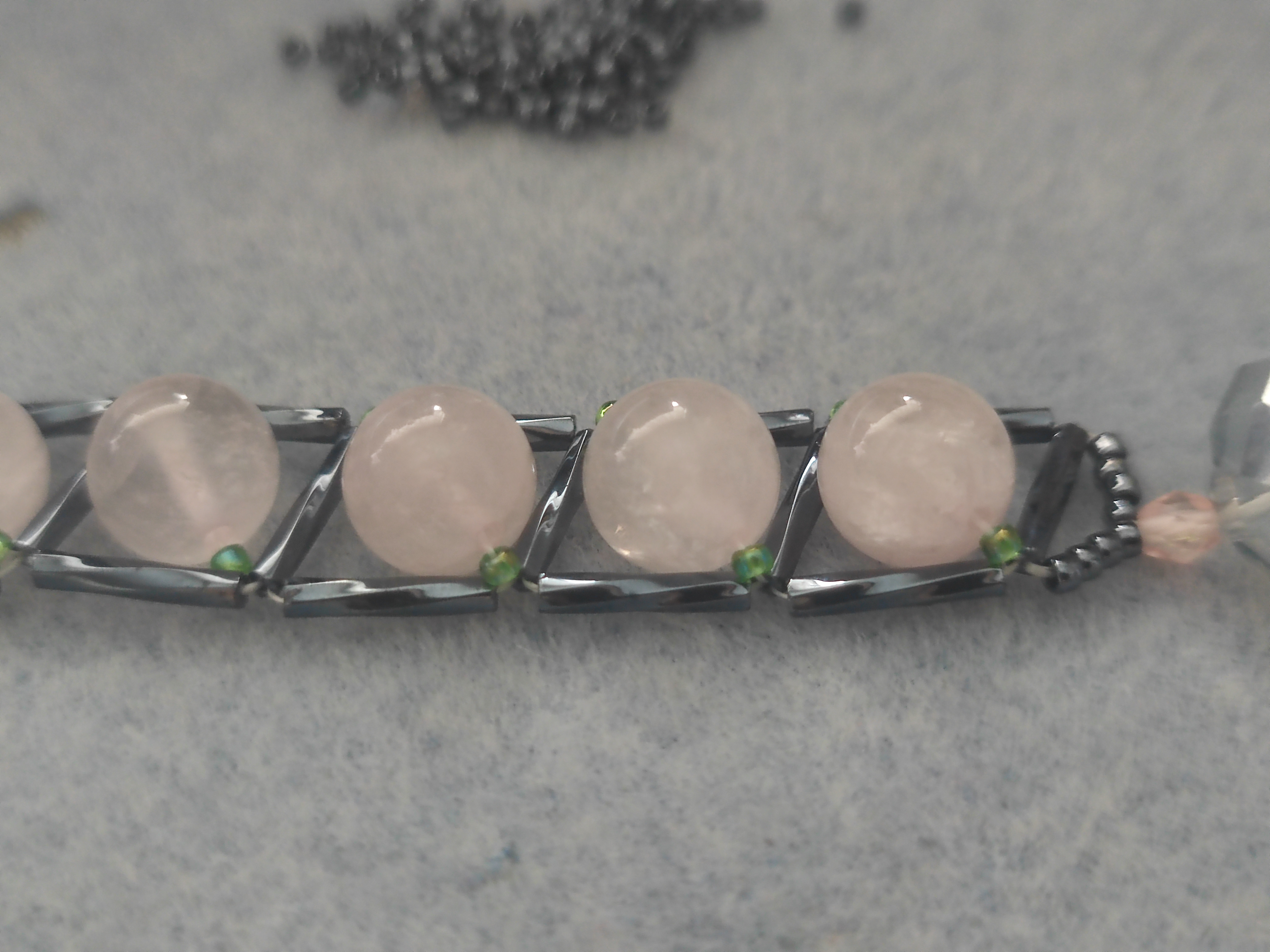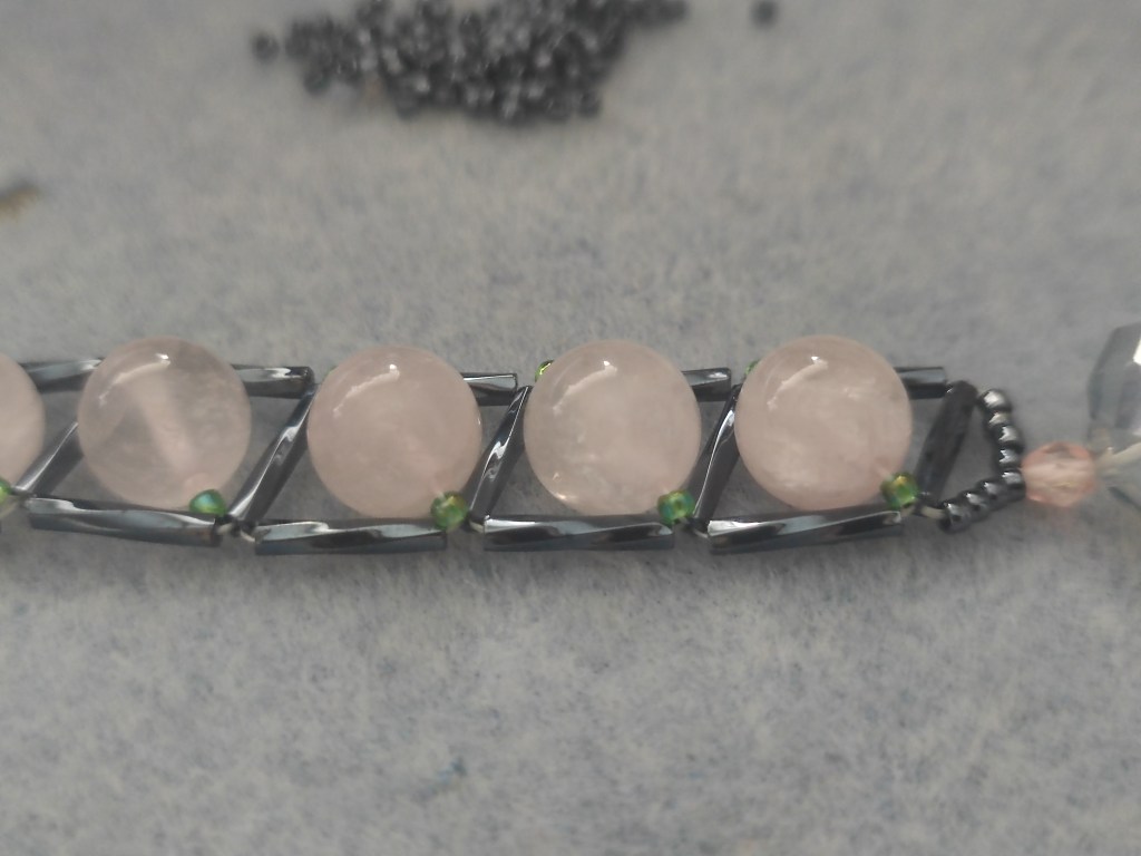 Next step was to run back down the bracelet and add beads to the squares. Because of my larger bugle beads, my plan to use my 6mm pink faceted beads for the centres of the squares didn’t pan out. The only pink bead I could use was this set of 8mm round rose quartz beads – the colour was not quite what I wanted as it was very light compared to the bugle beads (and I wanted something similar to hot pink), but it sort of worked at the same time because there are some light pink flowers on the dress.