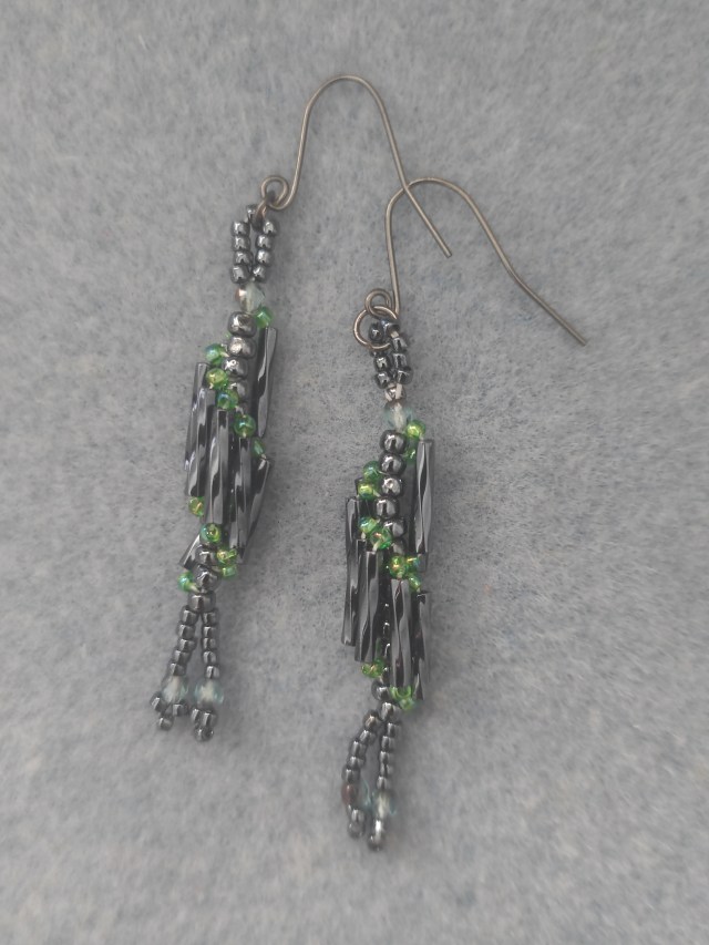 It doesn’t take long to make earrings that are about 4cm in length. I made some earring hooks out of gunmetal pins and attached them to a seed bead loop at the top.