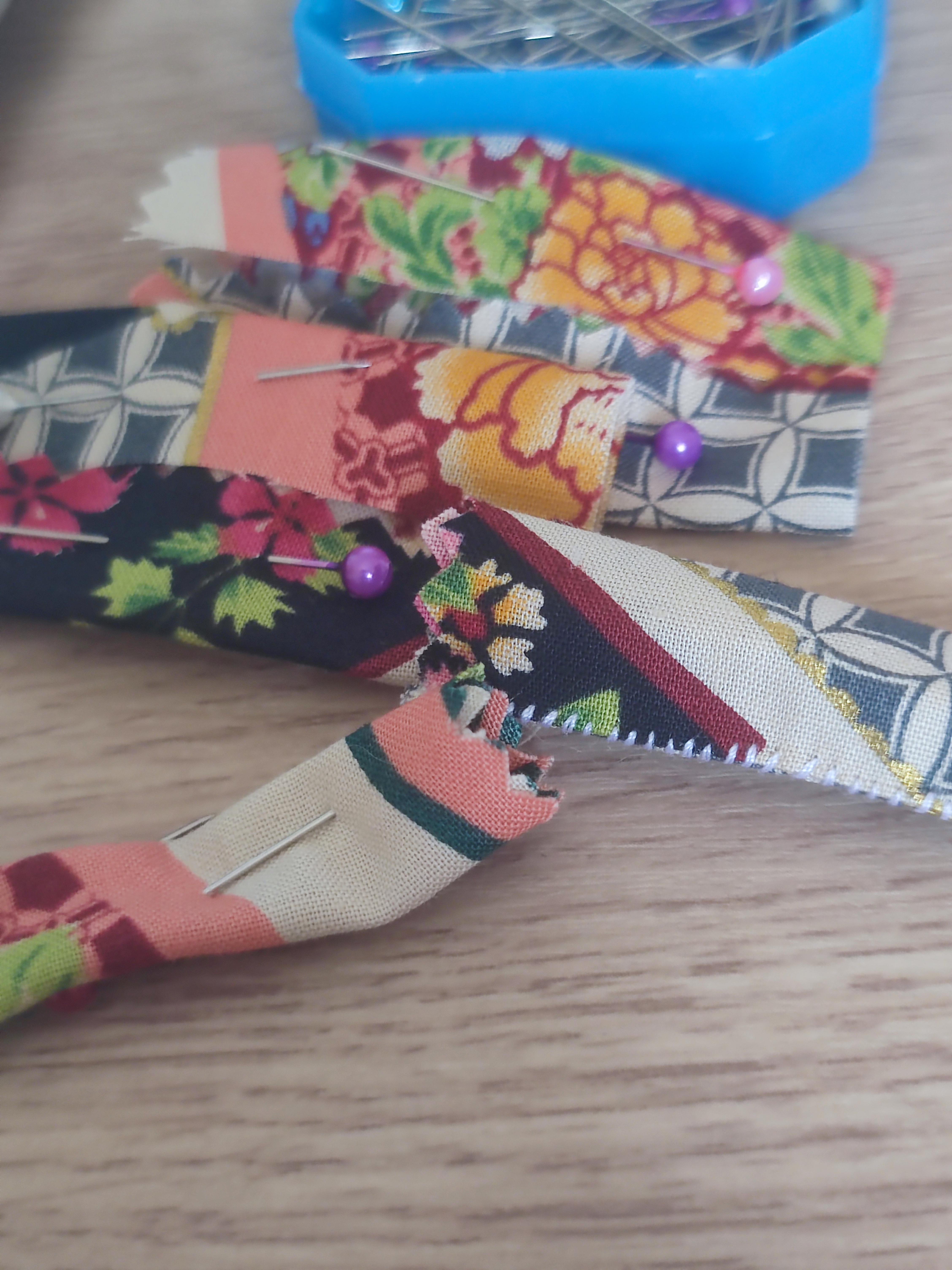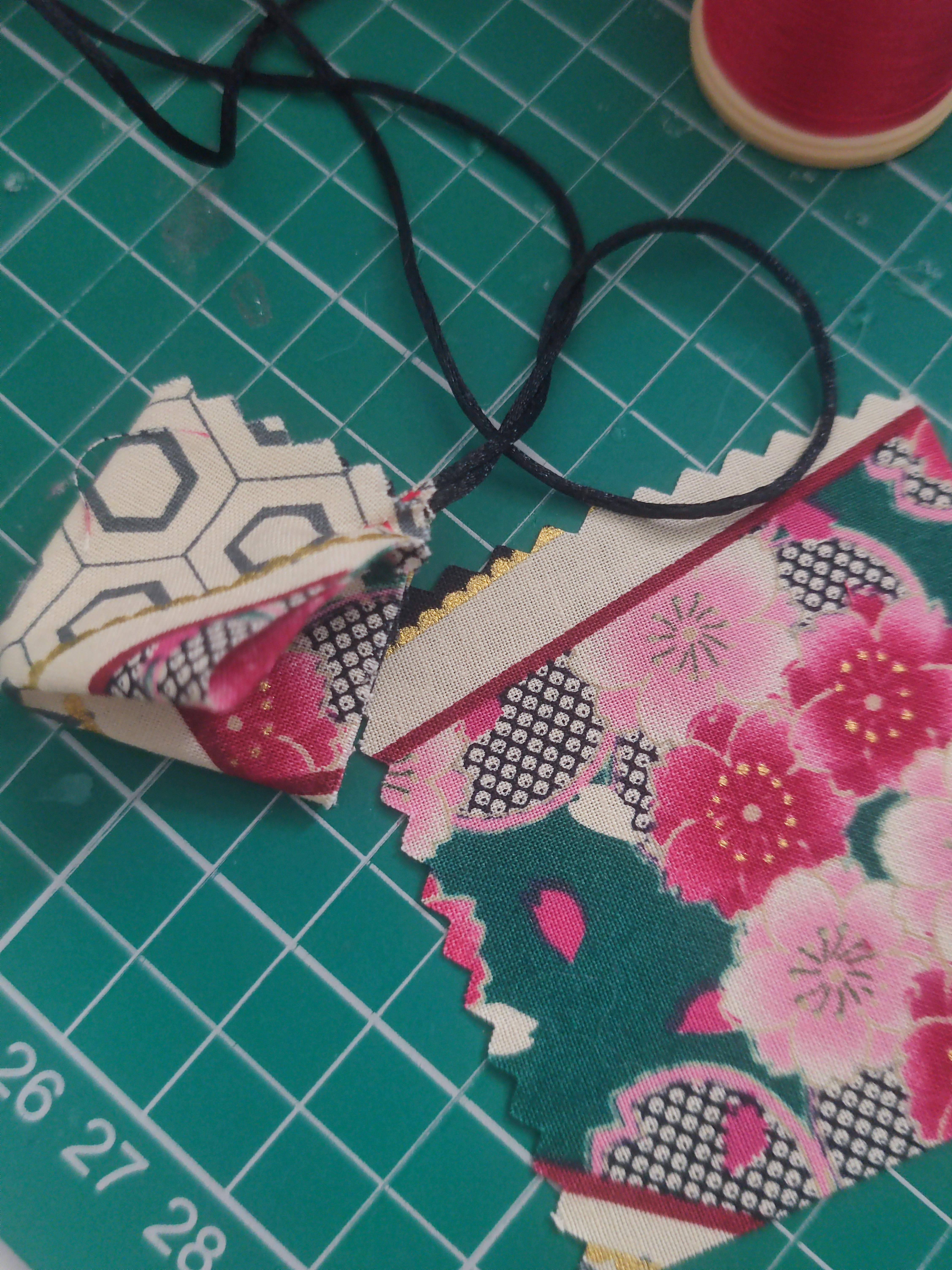 Before the cubes can be combined, you need to make some loops for the drawstring to go through. I took one of the spare squares and cut it into four smaller squares. Now there are a couple of steps to turn these into loops. It needs to be folded in half towards the centre, then folded in half lengthways again. Then I applied whipstitch to secure this edge, and finally I pressed it with pins and heavy objects so that the whipstitched edge is hidden from view. You could match the colour of the thread if you wanted to here.