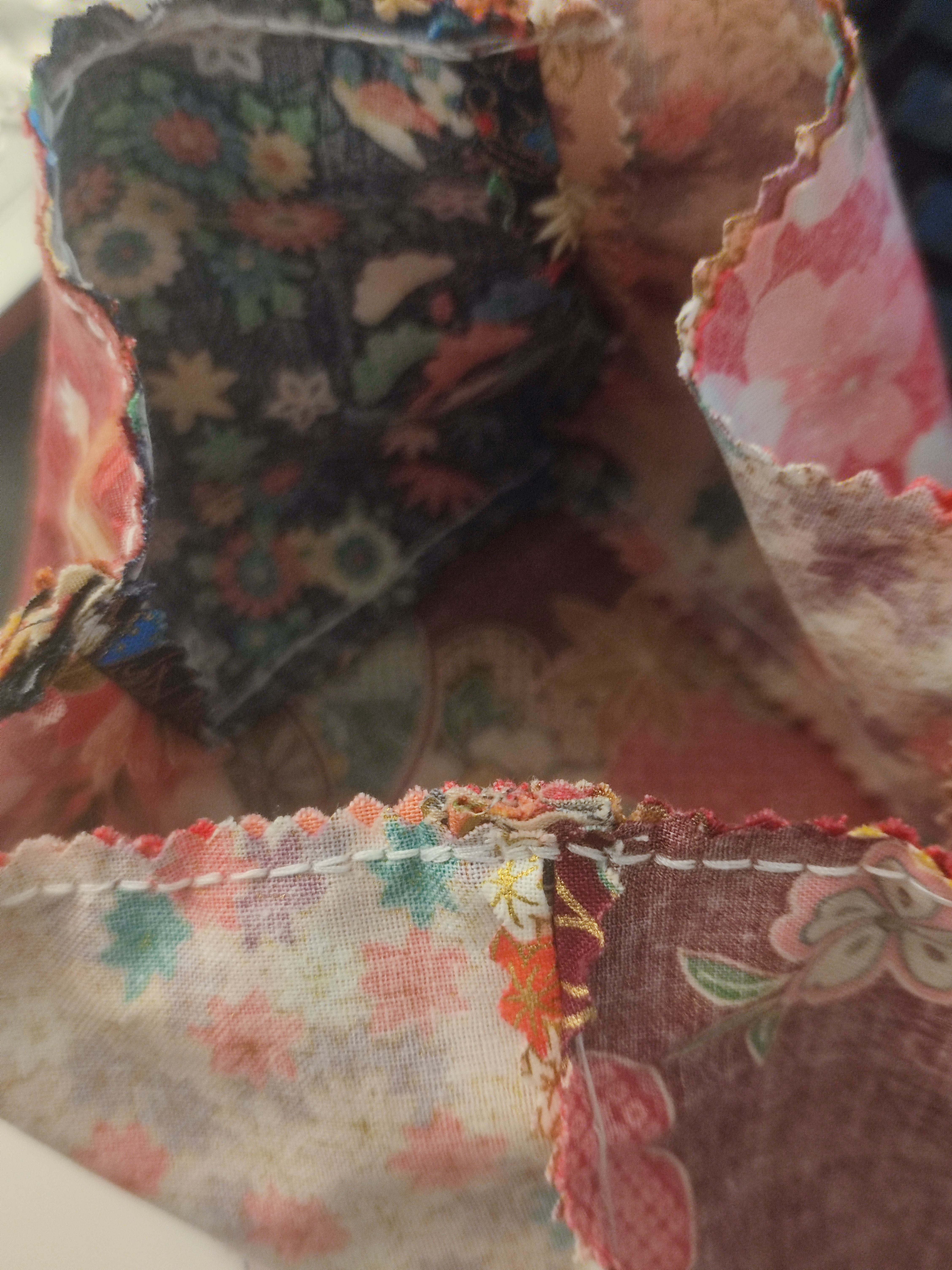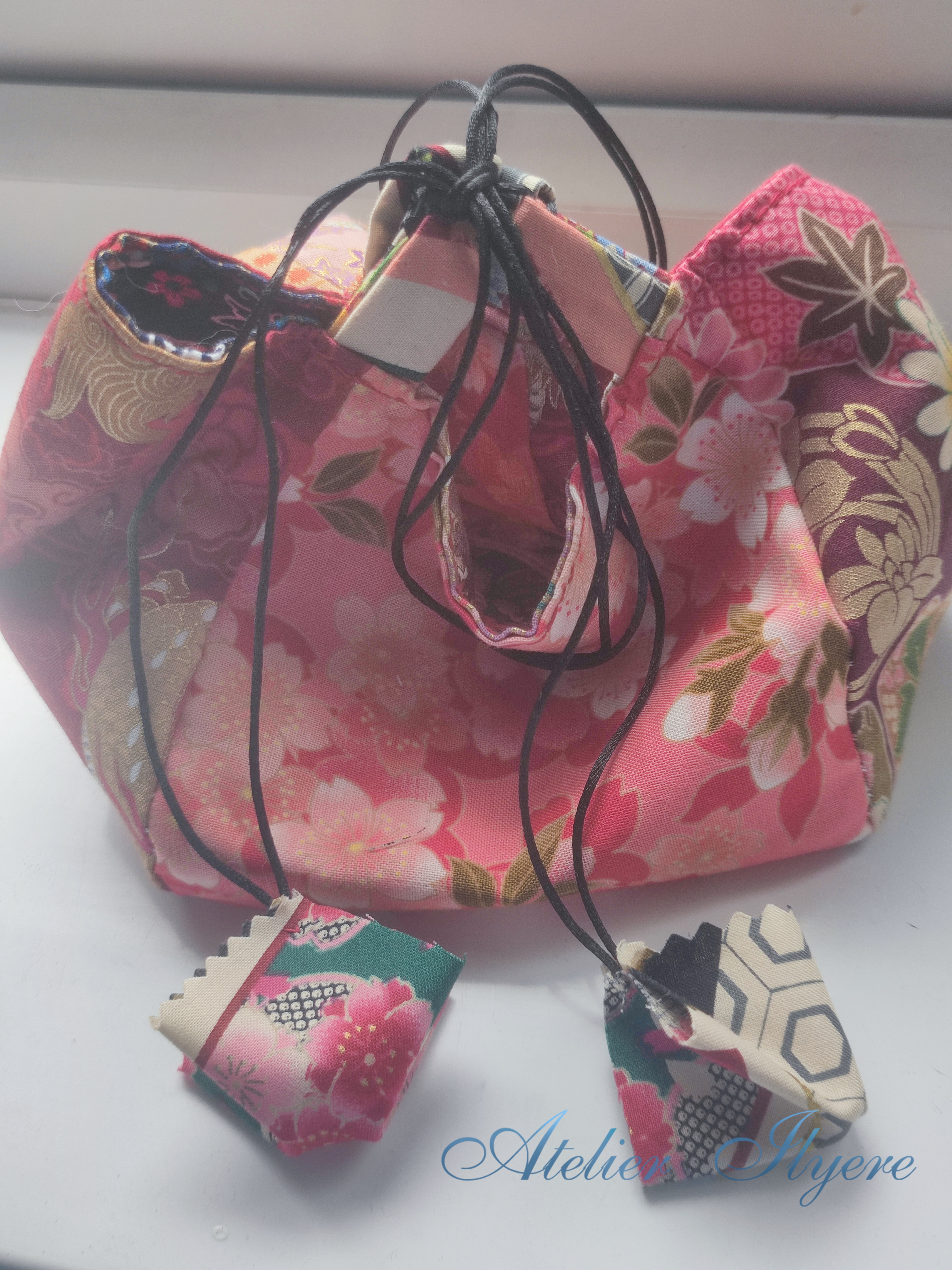 The finished bag! It does look very cute. The square at the base allows the bag to sit upright properly and flat, and you can tie the bag closed with a double loop. I’m not sure what I could use it for at the moment, but it looks like it could be a way to hold some small future projects? Or some precious items on a shelf.