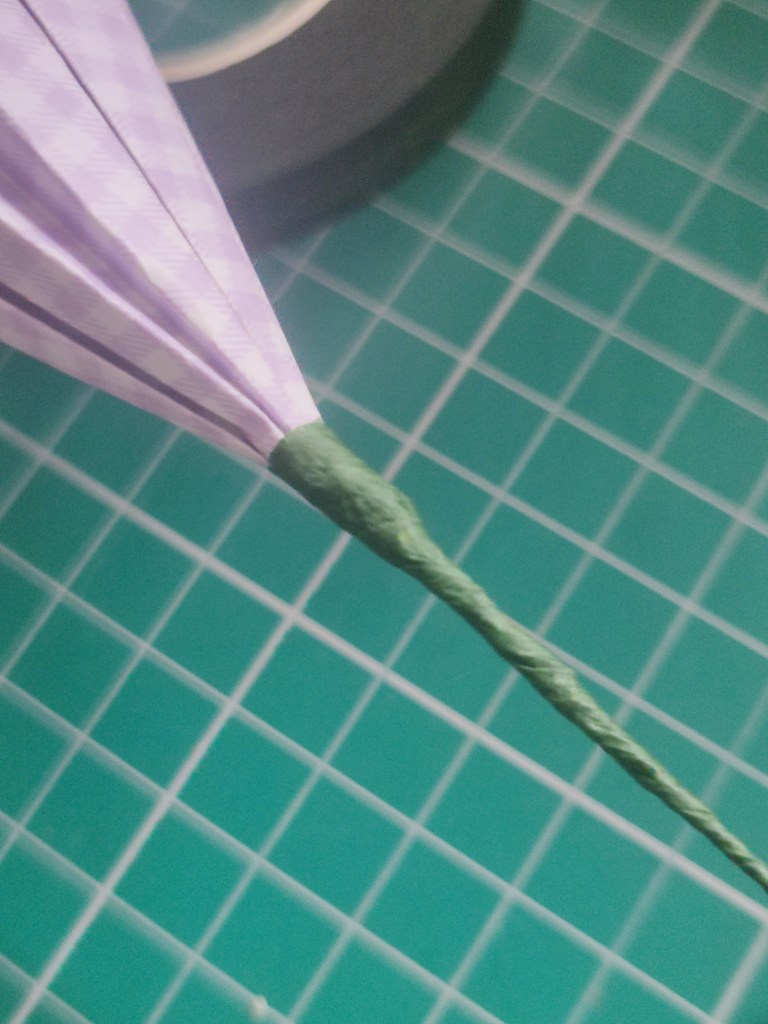 When passing the wire through, you want to go as far as the bottom of the twisted loop, otherwise it will tear the paper and potentially ruin the flower. I use florist tape to start below the flower and then wrap upwards to secure the part of the flower that covers the loop – it will look a bit thicker but this is actually fine as it is similar to actual nature! (Look up a ‘receptacle‘ of a flower!) Then you wrap down the stem as usual. It is a lot more work but the results are great.
