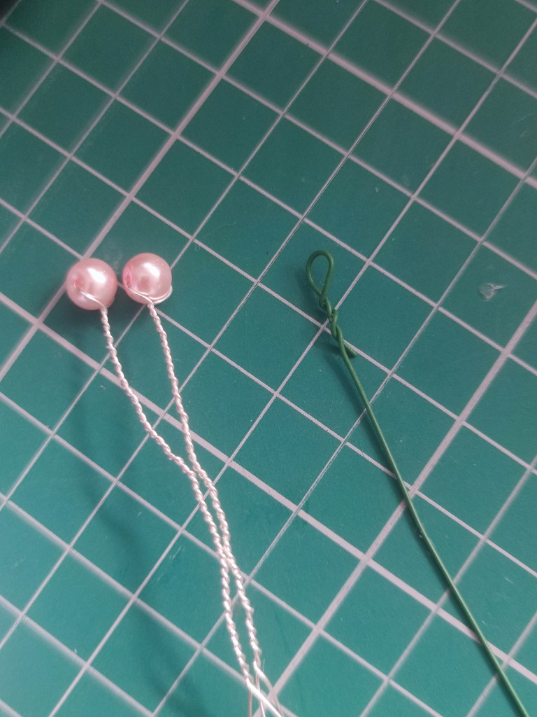You can actually just fold a lily flower and just use that in your bouquet, but a lot of people like to add stamens to theirs to make it a little more realistic-looking. You can use either premade stamens, or wire some up yourself. Here, I’ve wired up some glass pearls to 0.4mm silver wire, cut to the size of the flower, and twisted the end of a florist wire to make a small loop. Then I secured the stamens to the loop as tightly as possible, as this will go inside the flower.