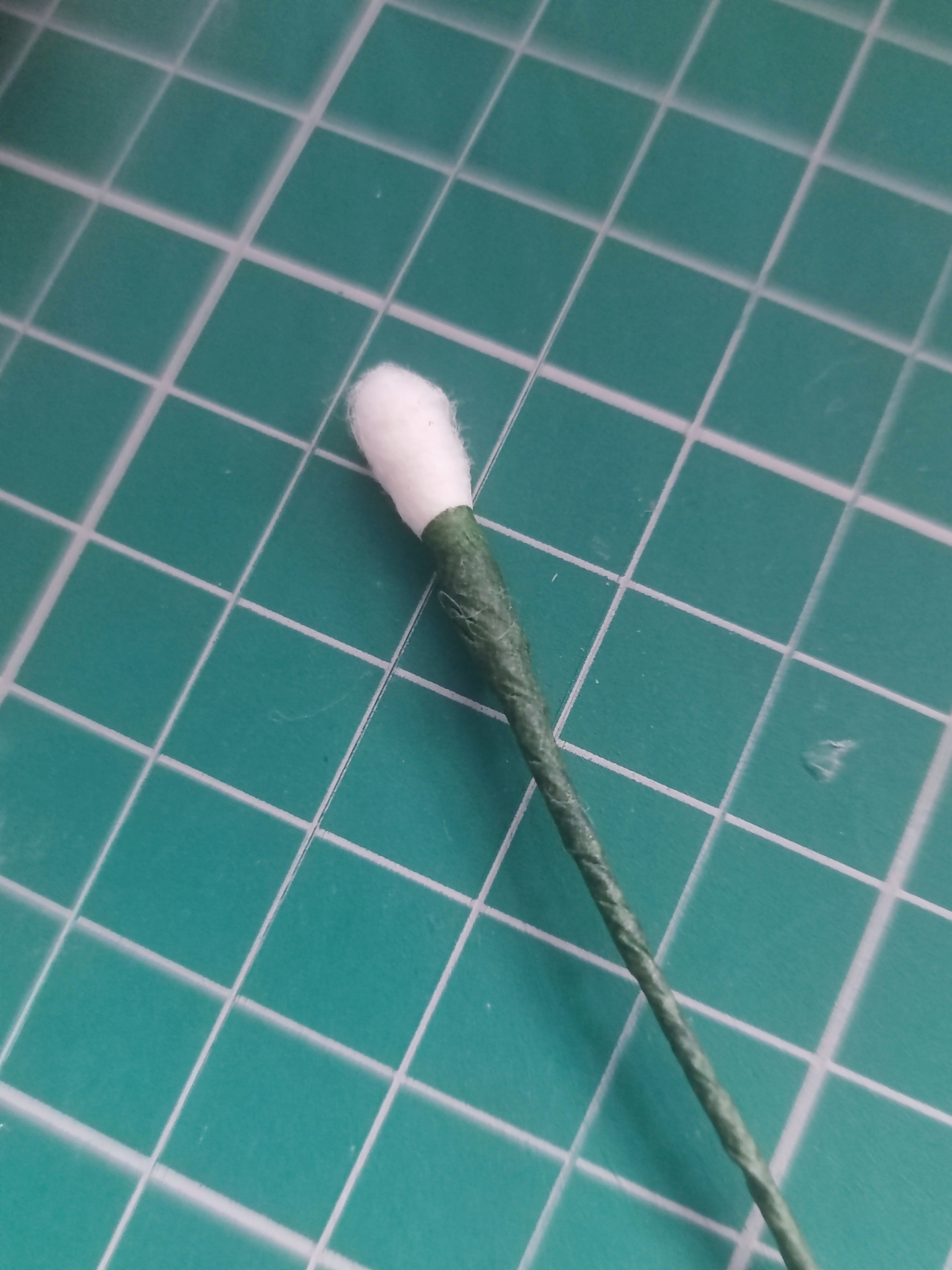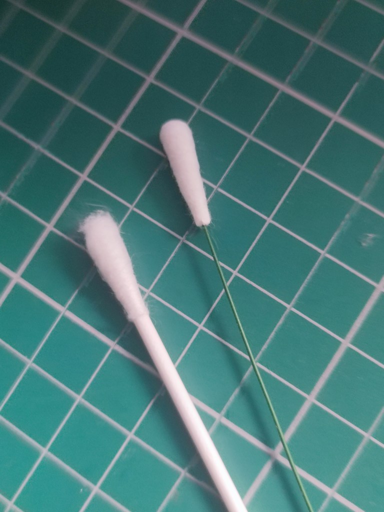 If you want to use florist wire for tulips, you can choose to use them as is because they are quite sturdy, but for a bit of added security, I cut the tip of a paper cotton bud off and poke the wire stem into the centre of it. Then I wrap it with florist tape to secure the cotton bud.