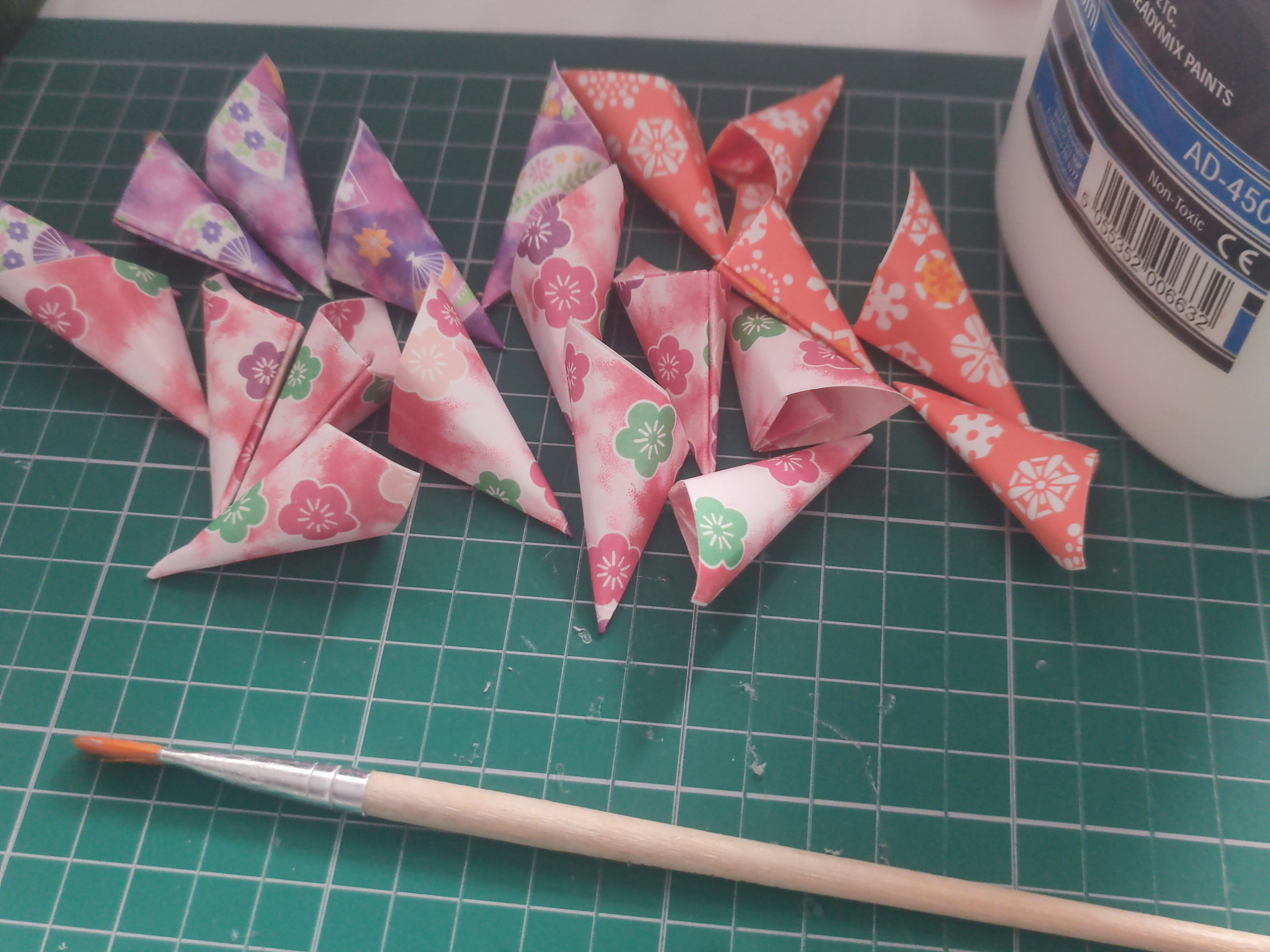 I usually make five-petal flowers folded from 7.5cm squares (I cut them from 15cm squares which is standard origami size) in my projects, and I strongly recommend that you use PVA glue or something similar first when gluing the petals together in case you make a mistake with lining the paper up. I apply a thin layer using a small paintbrush, and use a paper clip or something similar to hold the petals together.