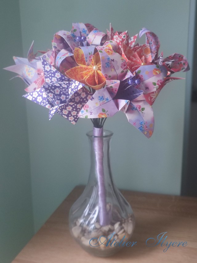 With double-sided paper, I like to fold four-petal lilies. With one-sided paper, I like to fold tulip bulbs, or I like to cut them into smaller squares and make kusudama flower petals. So it was fairly easy for me to decide the composition of my bouquet!