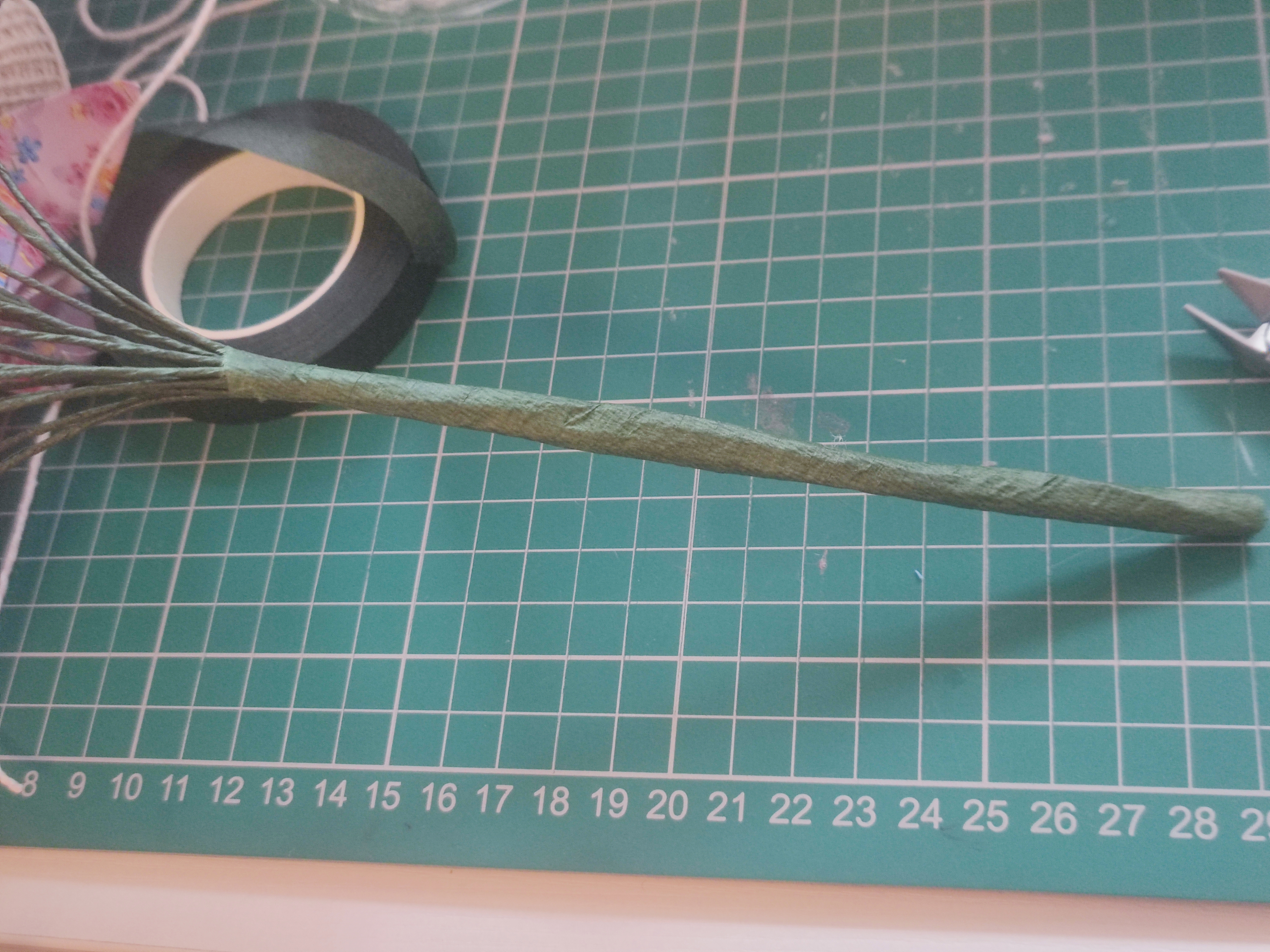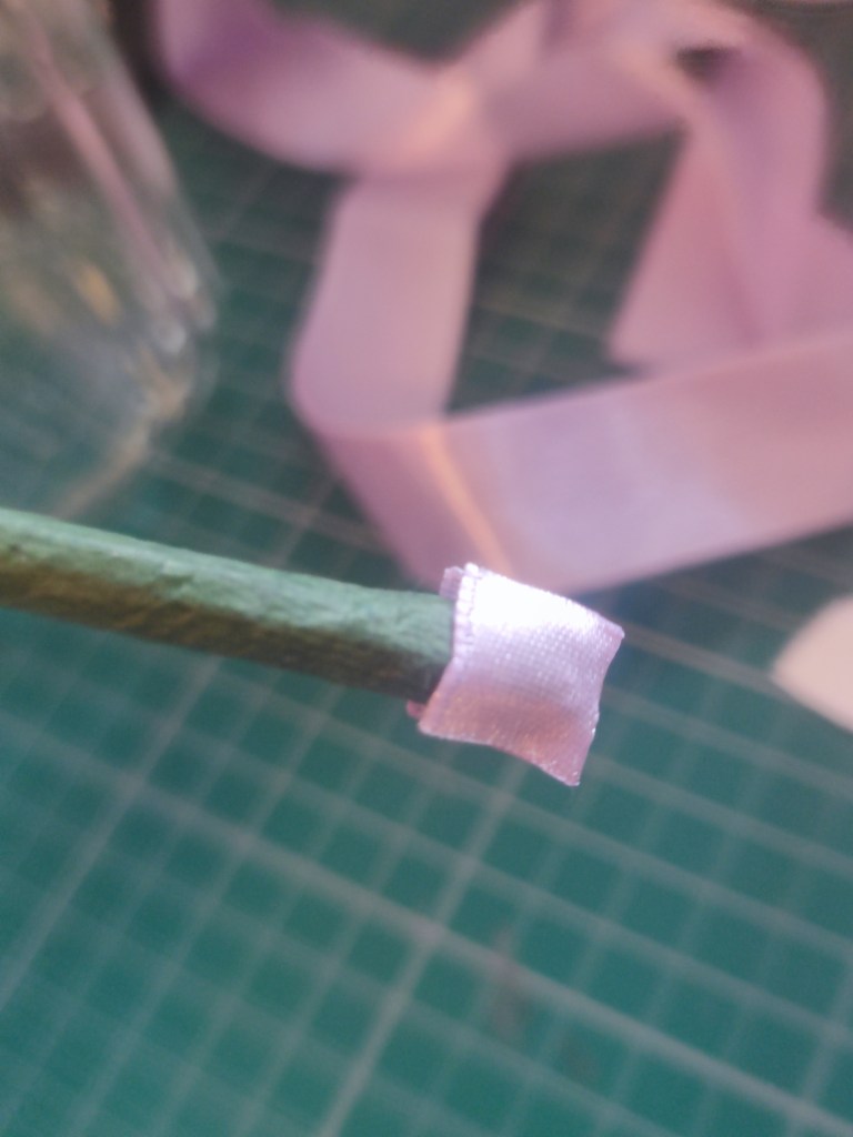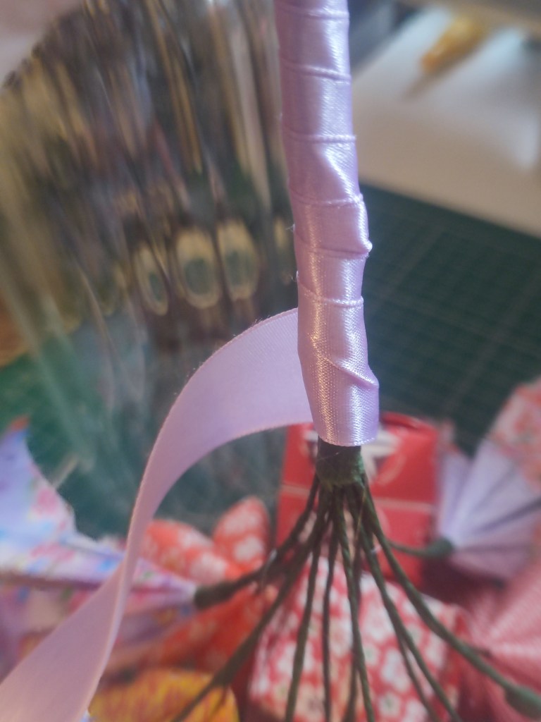 I had a length of light purple satin ribbon to cover the stem with. I cut a tiny bit off the end to cover the base of the stem, then I started wrapping from the base up to above the florist tape. I applied some hot glue at every interval to keep the ribbon secure. I would not recommend using a line of hot glue all the way up the ribbon, as it may show on the outside. I tried to keep the ribbon smooth but it does get tough near the top end.