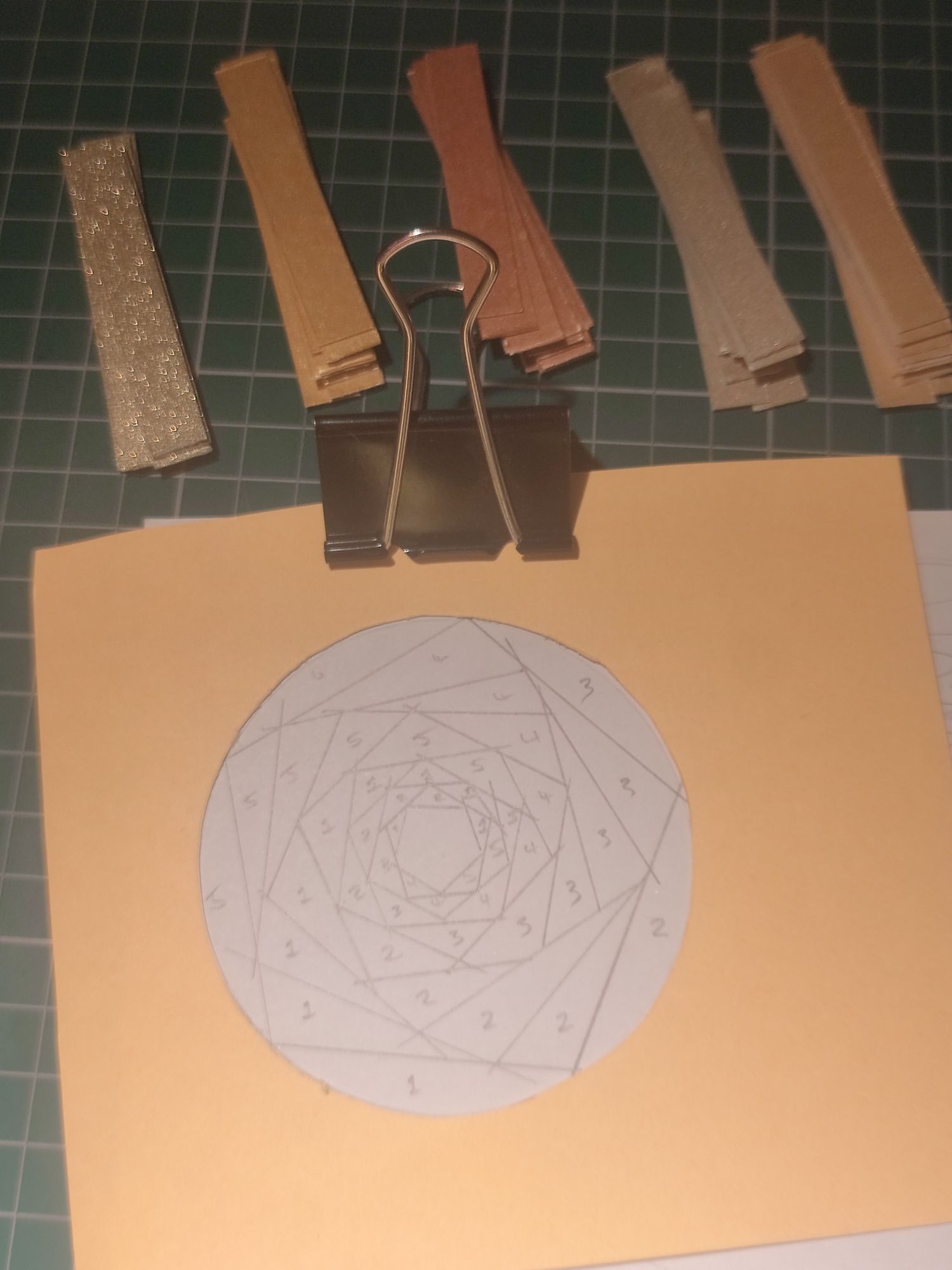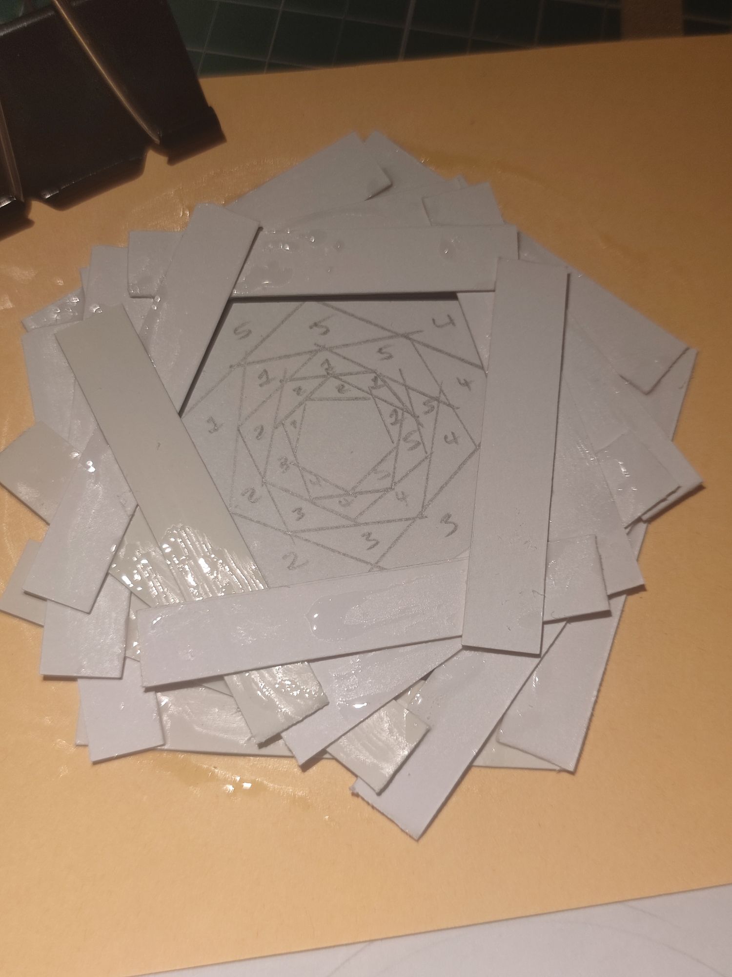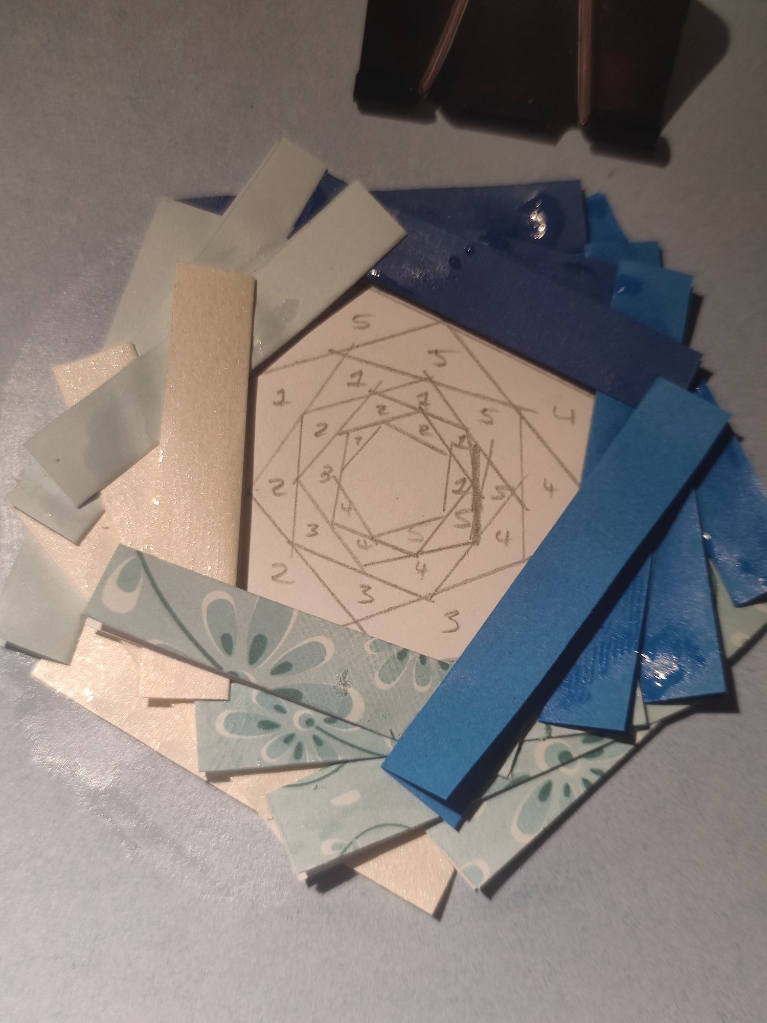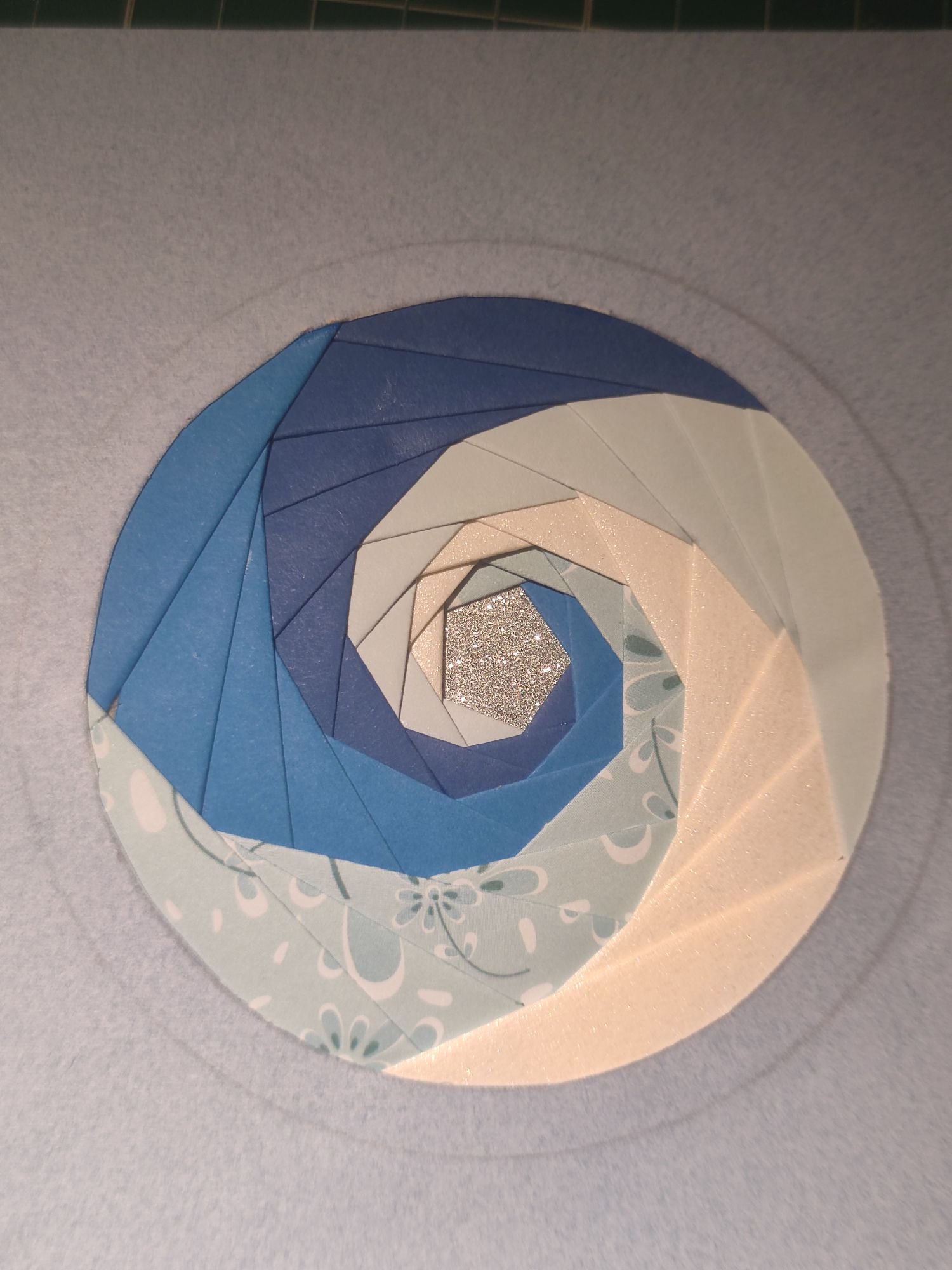 When all the paper is glued down, the centre needs to be covered up and I used a square of silver glitter card. Then you can hold it all down with double-sided sticky tape, to ensure that the paper strips won’t move. Flip it over and hopefully it looks good on the other side! My pentagon was a bit wonky but not too noticeable here.