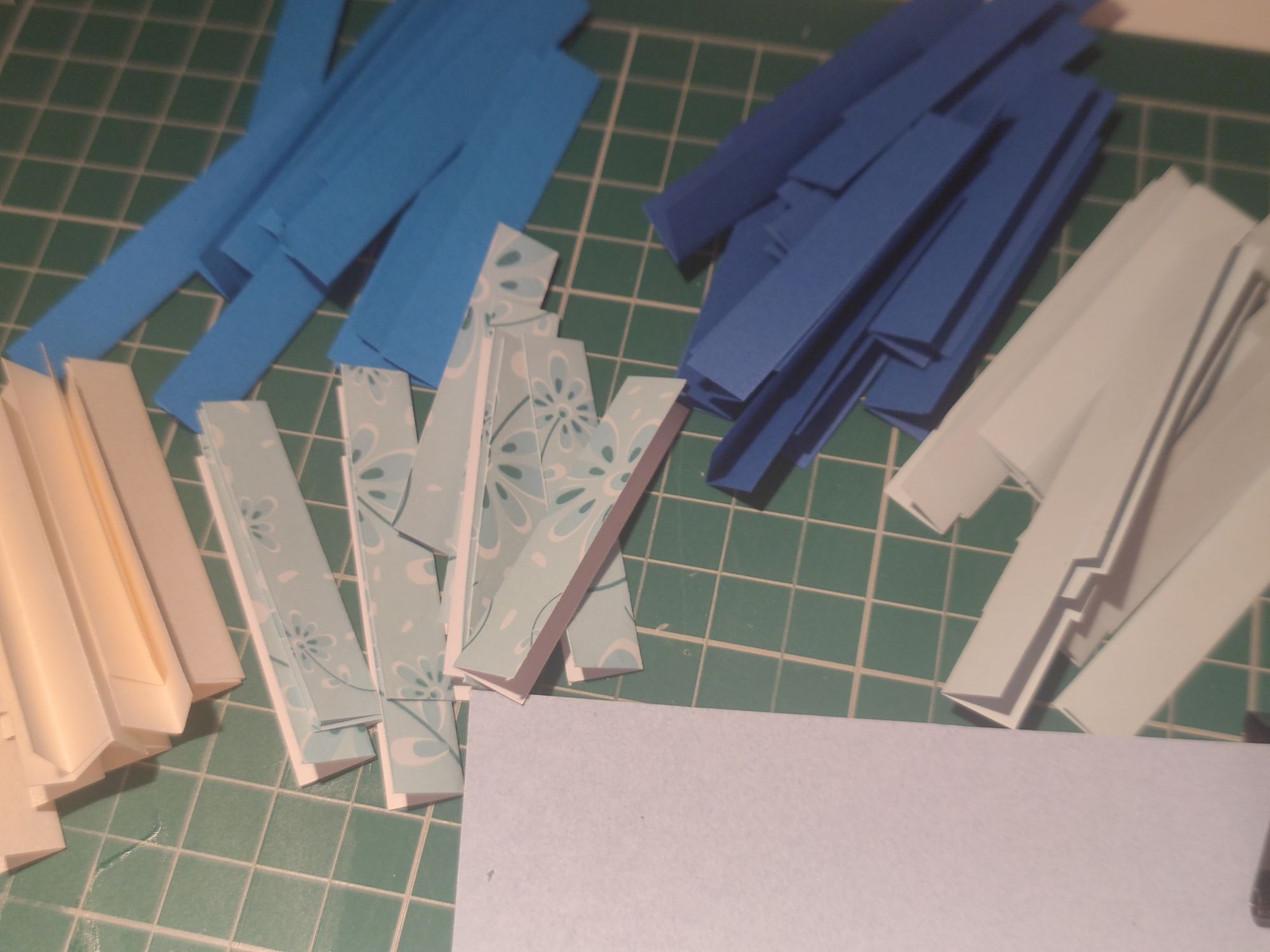 I didn’t have the exact same patterns as the project, so I got my five best shades of blue and blue patterned paper and made the 5cm folded strips as required. The folding in half lengthways is required so that a straight edge is shown in the bauble, but I guess you don’t have to do this step if you are confident in cutting a straight line in your paper.