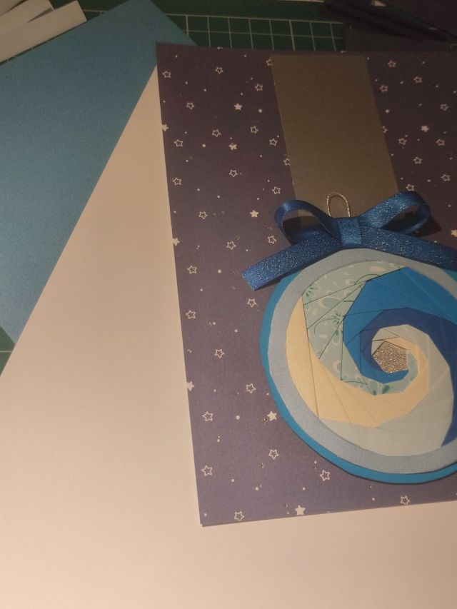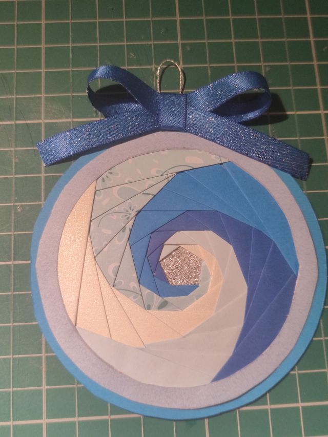 The outer circle is the next part to cut through. When you use your craft knife at this step, it will cut through all the layers of paper, so the glue and the tape should help to stop everything from moving. This part then needs to be stuck on another piece of card to hide the back. Much like the project example, I glued on a pretty blue ribbon bow and some silver thread to resemble a bauble. You may need to use hot glue for the ribbon, so be careful when applying it to paper.