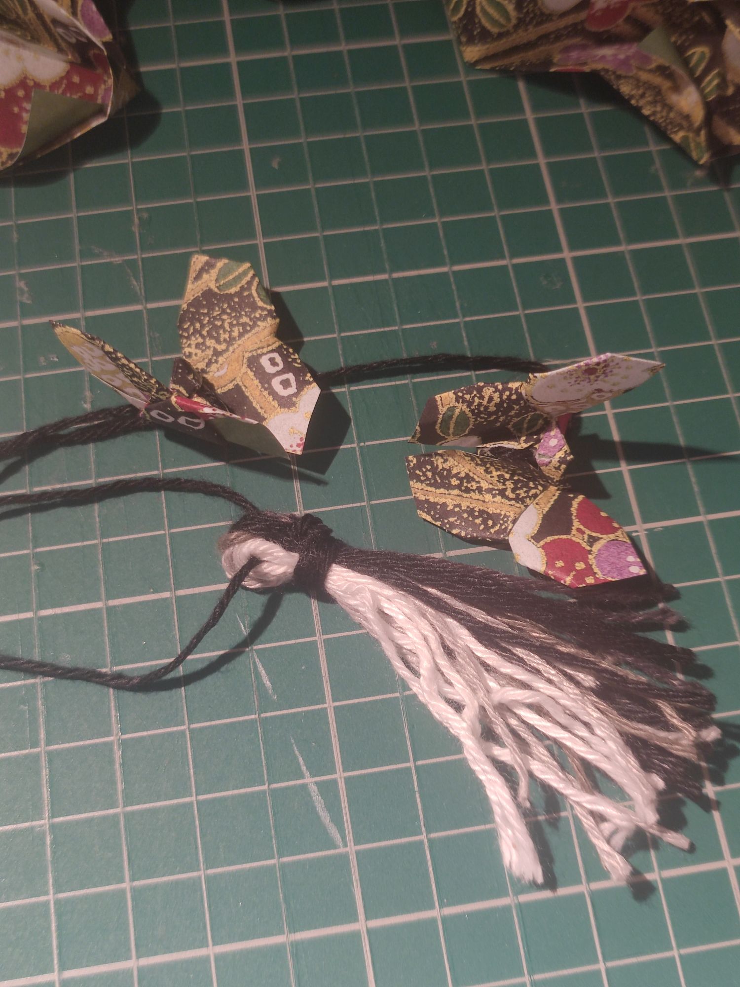 You’ll have noticed that if I cut four squares from every piece of 15cm origami paper and I wanted 30 squares total, then I would need to cut from eight 15cm squares and end up with 32 total. What can you do with the other two? I like to fold them into small accompanying pieces so I made some Yoshizawa butterflies and attached them to black twine. You could keep the spare squares as back-up units if something went wrong though.