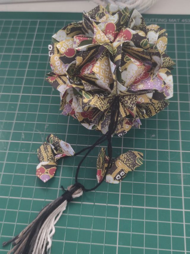 The finished model! It measures quite long due to the thread length so I hung it up high. I think the paper pattern really complements it well! The paper that I bought makes me want to do more modular origami – I could even revisit models that I’ve done before but with different pattern choices. Since it doesn’t take very long, I could do these in-between bigger projects, so expect to see more of this over the course of the year!