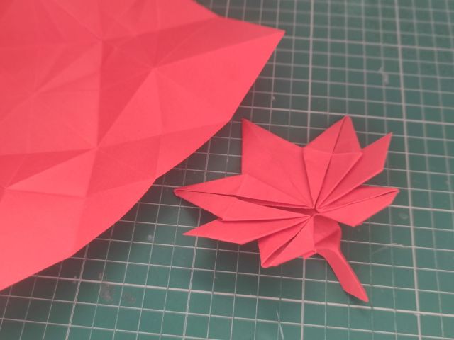 I cut out a piece of 20cm red paper to use as my base and folded a leaf that was about 10cm tall. If I wasn’t so pressured for time, I would have spent more time focusing on neater folds, but you work with the limits that you are given… Fortunately the result was serviceable enough!