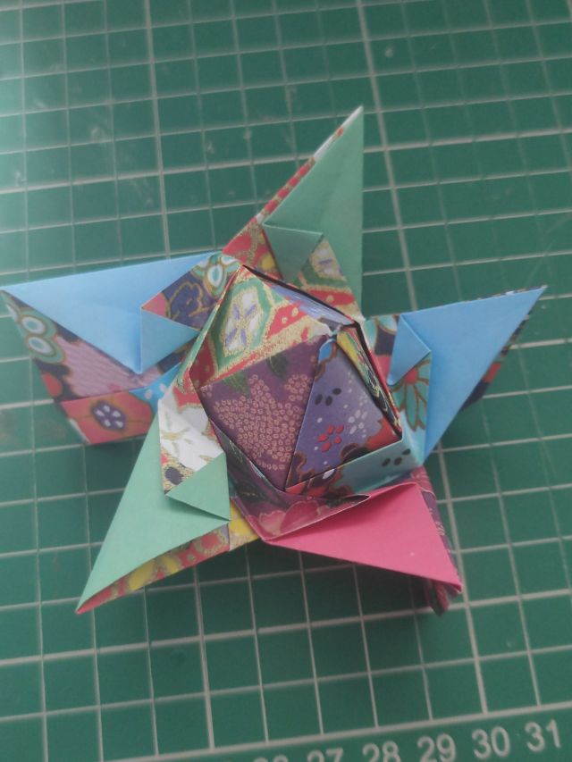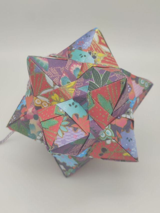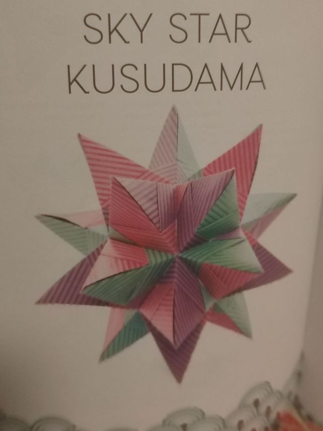 The Sky Star Kusudama was interesting to me because I’ve only previously made ball-shaped kusudama before (it’s in the name, really), so making a more angular one was somewhat new to me. The modular assembly follows the usual rules but here it forms little spikes. As it turns out, this is just an example picture and not at all what you have to make.