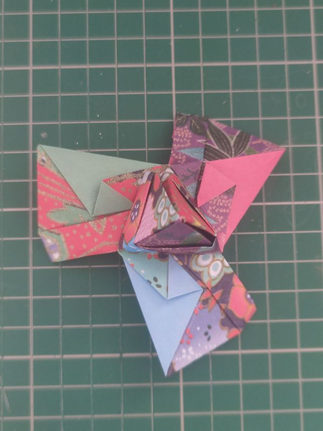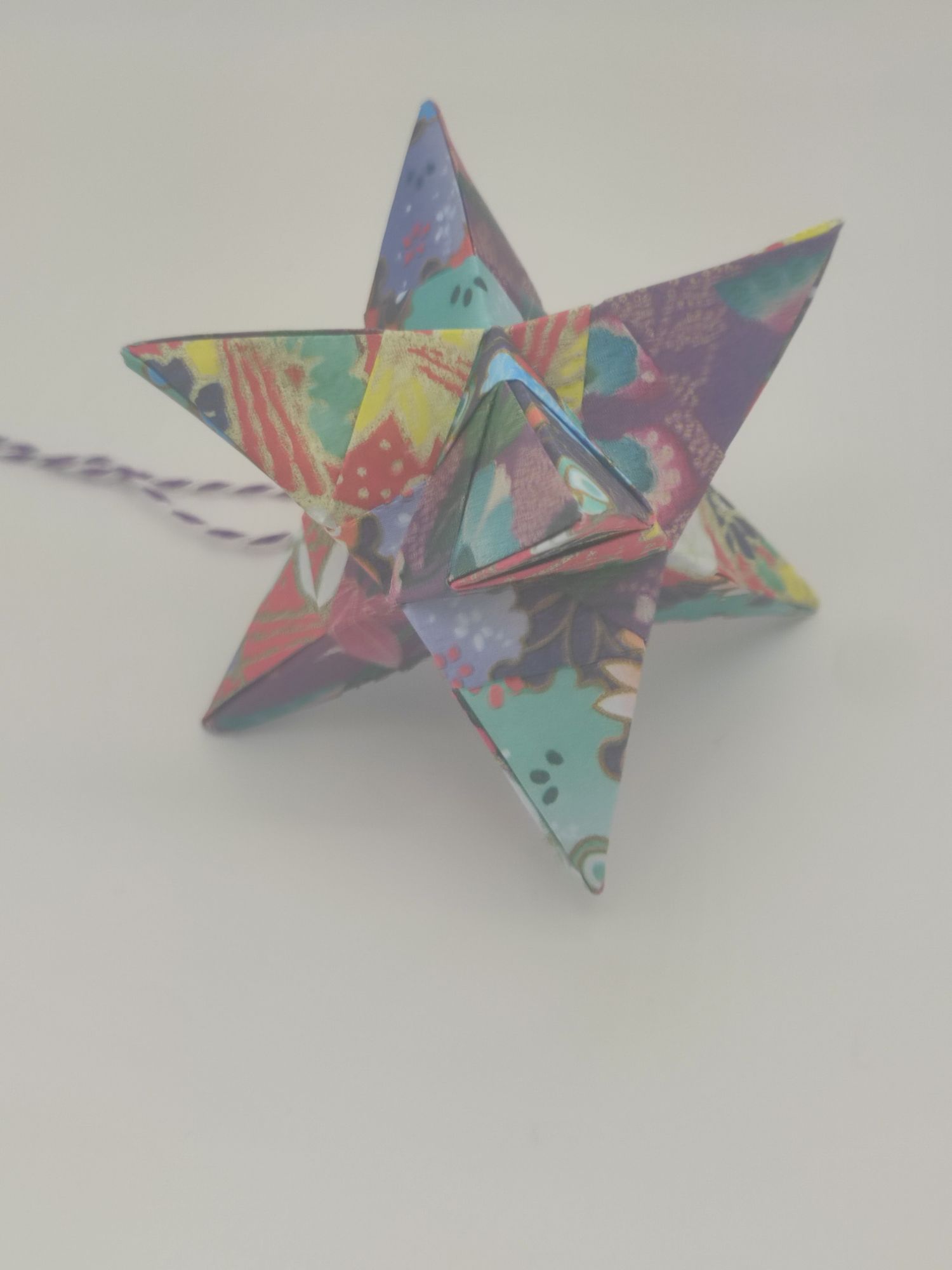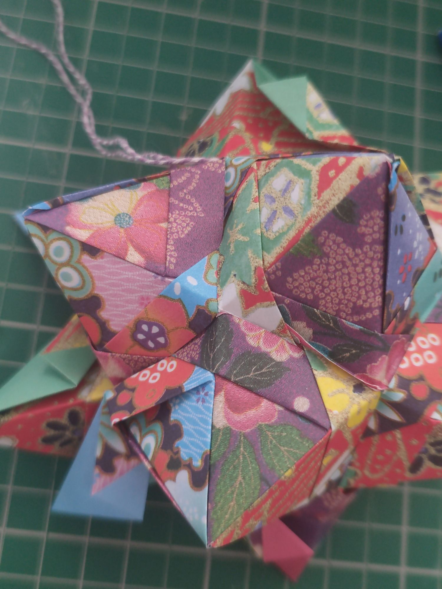 Each piece then links to another cluster to form another pyramid. The resulting model is an eight-pointed Sky Star Kusudama. I attached a loop of purple twine to the model before sealing it up. I used PVA glue when I was sure I finished assembly as the colours needed to not clash.