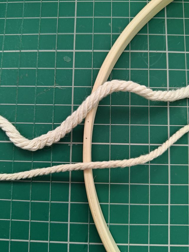 This time I would not make the same mistake – I cut 16 lengths of at least 2.5m and connected them up to my 20cm wooden hoop. These lengths pretty much touched the kitchen floor when I hung it up on the washing rack – for one, I wouldn’t like it brushing the floor constantly, but the main issue for me was my cat potentially coming through and getting his fur on it! I had to bundle it up on a chair for a bit until I made a few starting knots.