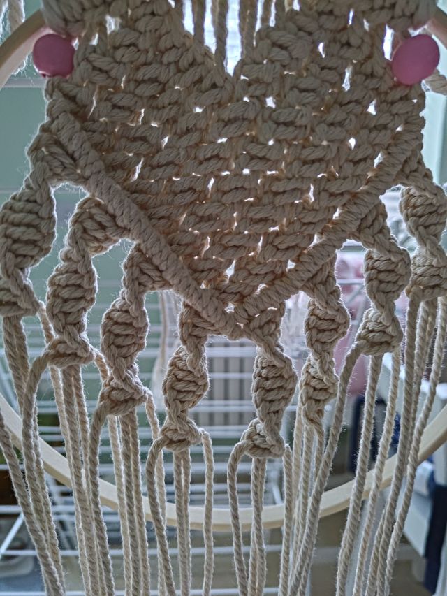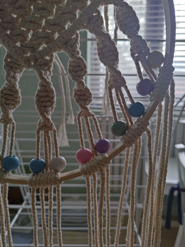 So here is my version two of the dreamcatcher finished! I’d like to use more beads in my macramé work, but these ones can only have one cord going through. You can get larger beads with wider holes – the hanging plant holder that I made previously could thread four wide cords! Hopefully I will find some in craft sales, there tend to be a few in the Christmas run-up as it is a busy period for any crafter!