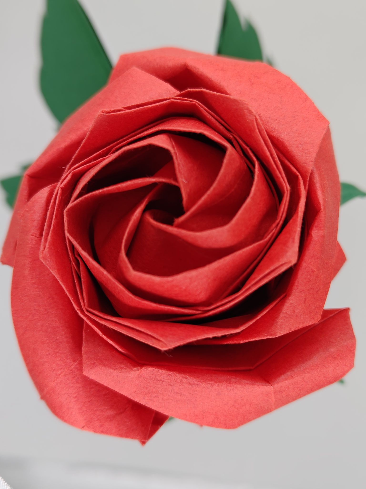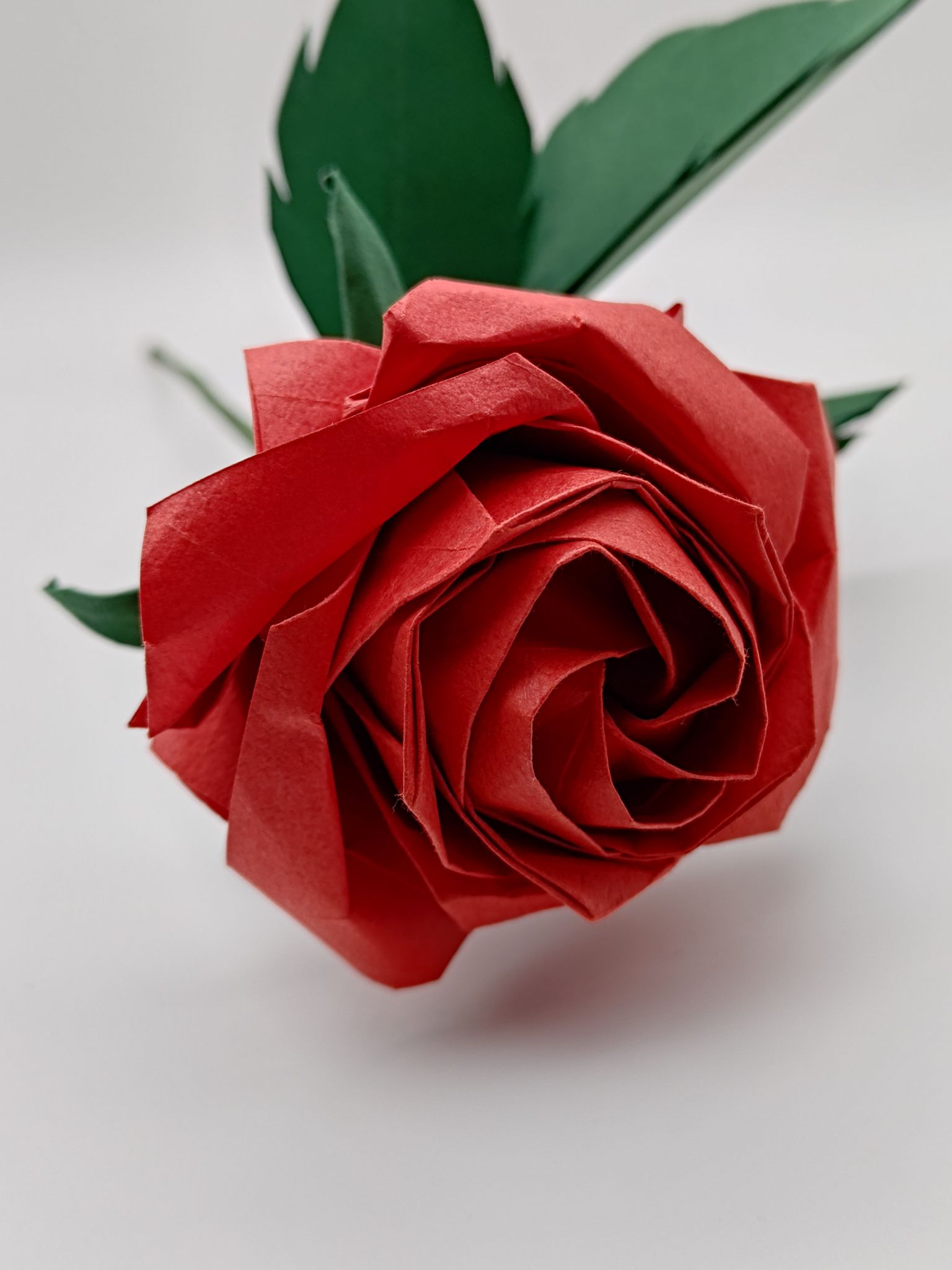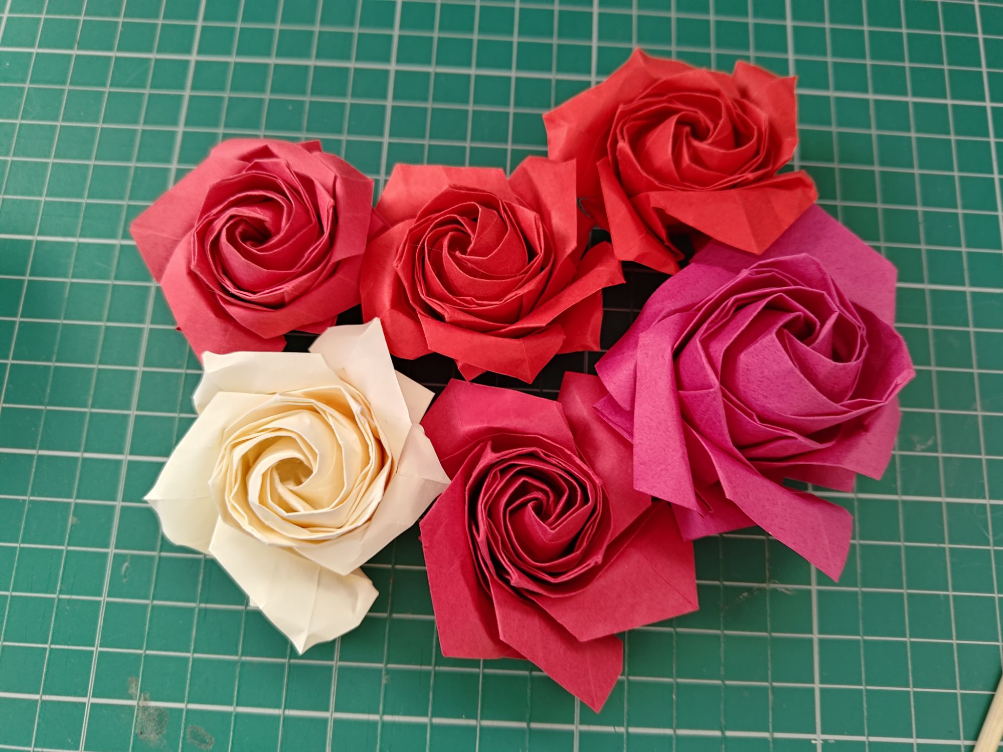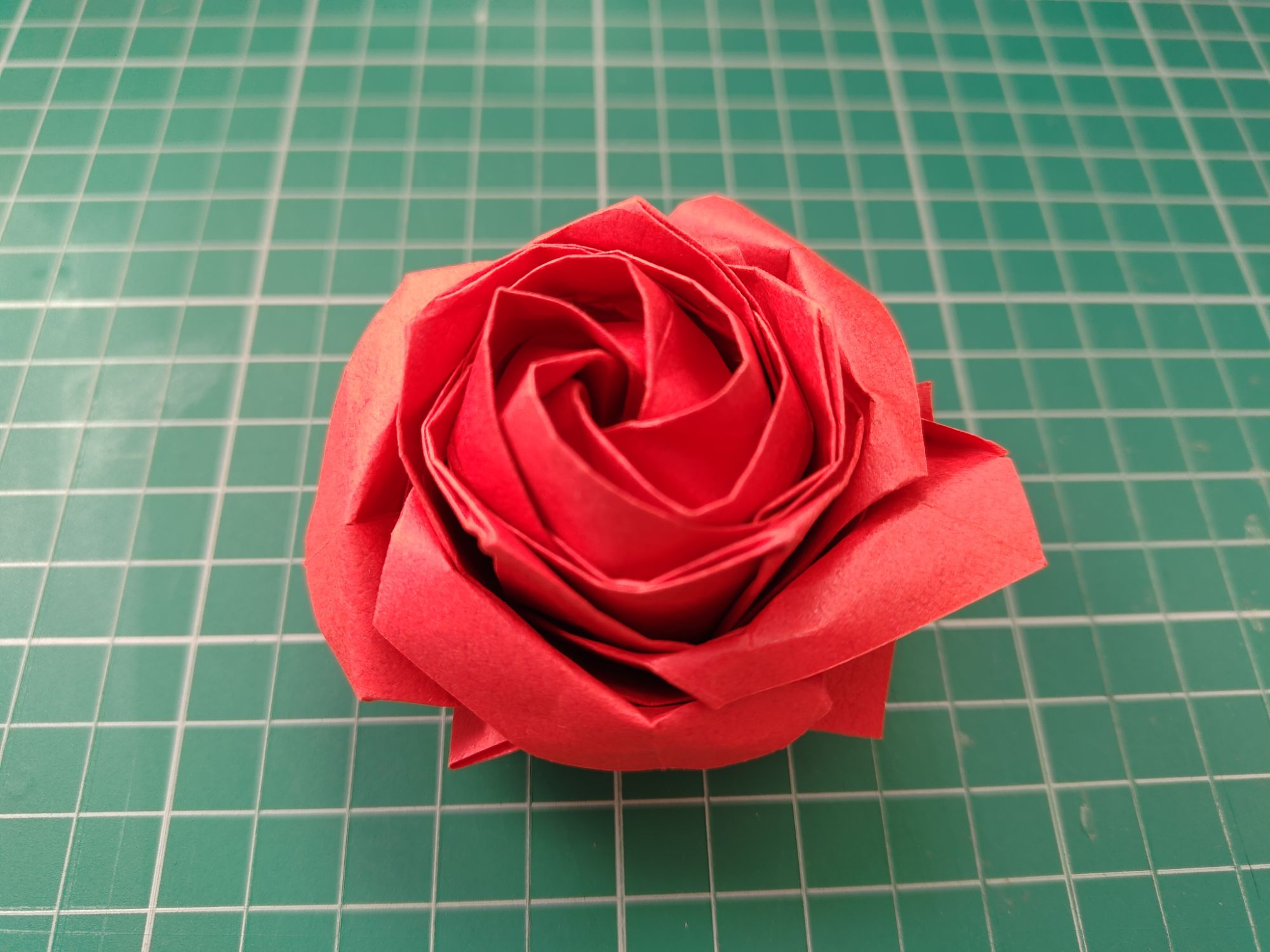 A bit of trivia actually; the first rose that I actually learned to fold was the Kawasaki rose, full bloom version. It is an easy-to-intermediate level design that creates a square four-petal rose and you can vary the folds to create different stages of bloom. But since it looked rather angular, I searched for other methods of making a rose and came across a pentagon rose. It is called that because you start with a pentagon (cut from a square), although some people also call it the Sato rose after the designer Naomiki Sato.