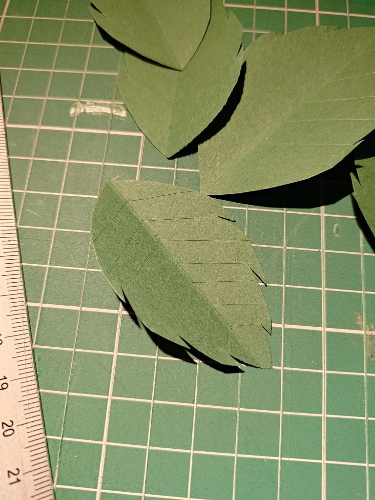 For a single rose, it would be good to make some leaves to go with it. A rose leaf usually looks like three leaves on a single stem, like a clover. I cut out some leaves using templates with a slight serrated edge. I also used my craft knife to lightly score the leaves in the middle and diagonally to look like veins.