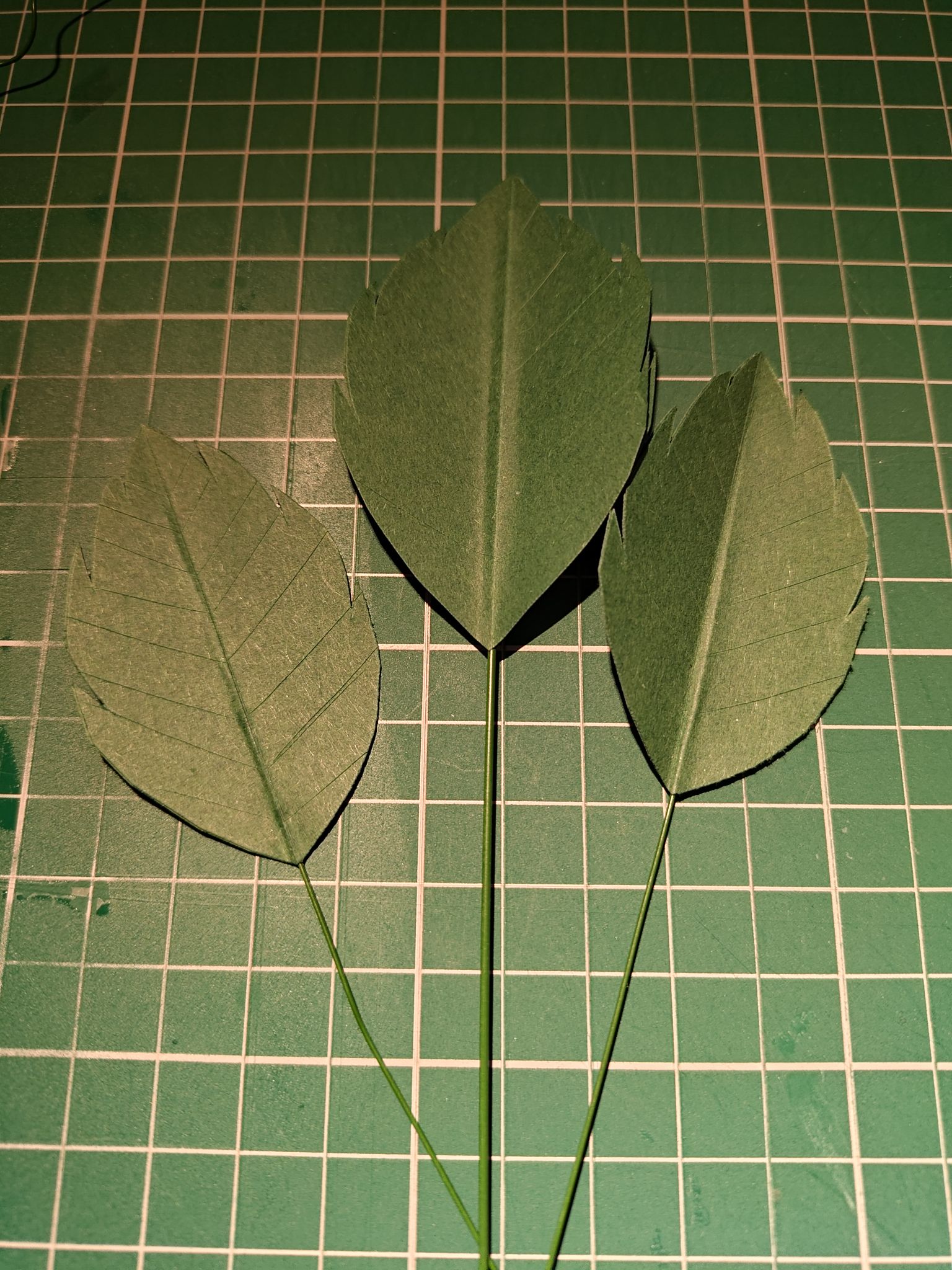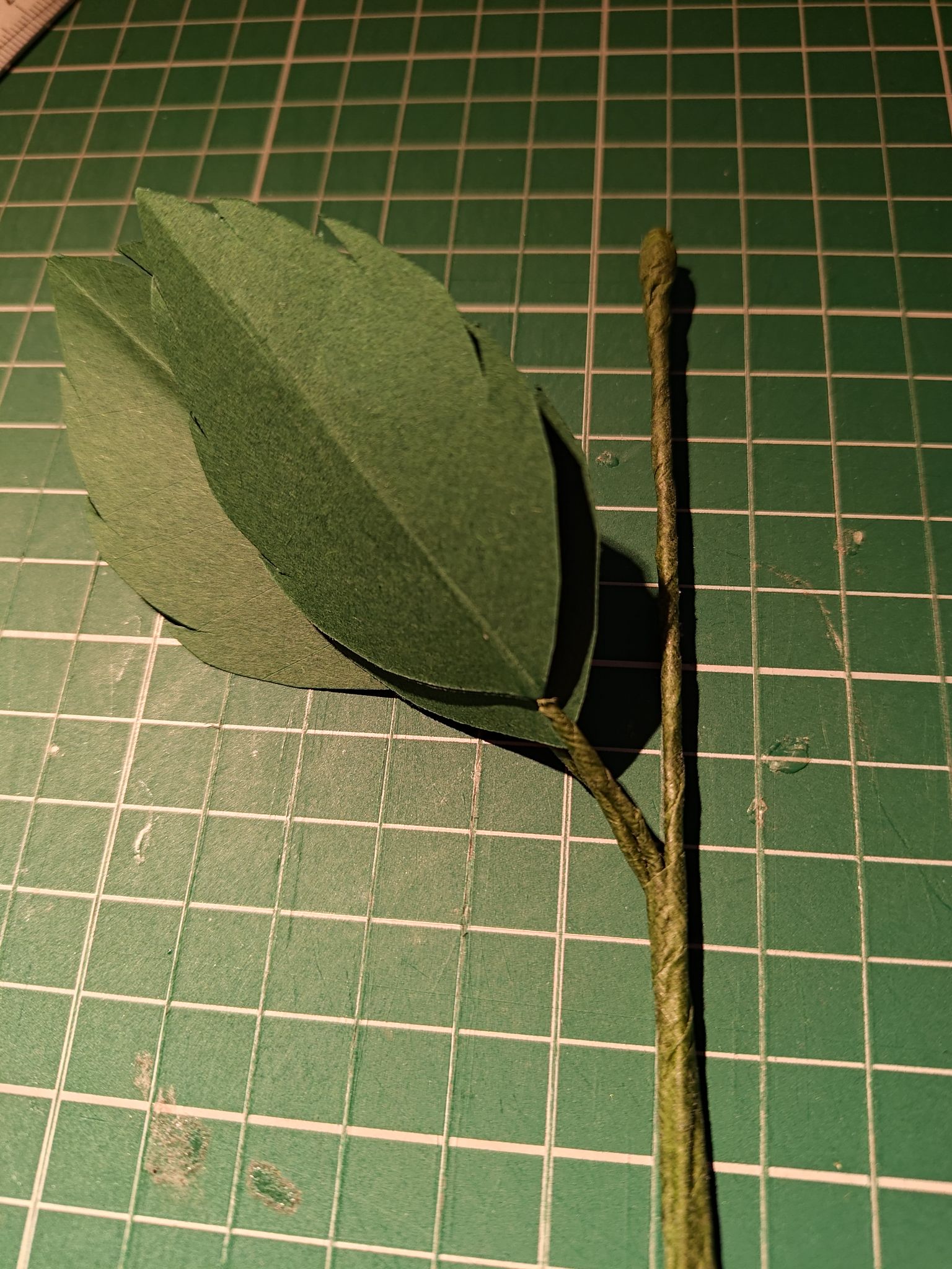 I attached the leaves to wire stems by applying wood glue and sandwiching the wire between two leaves to cover it. When done right, the wire lines up with the central line. I also chose to wrap the wires after attaching the leaves, but this might make the leaves less secure.