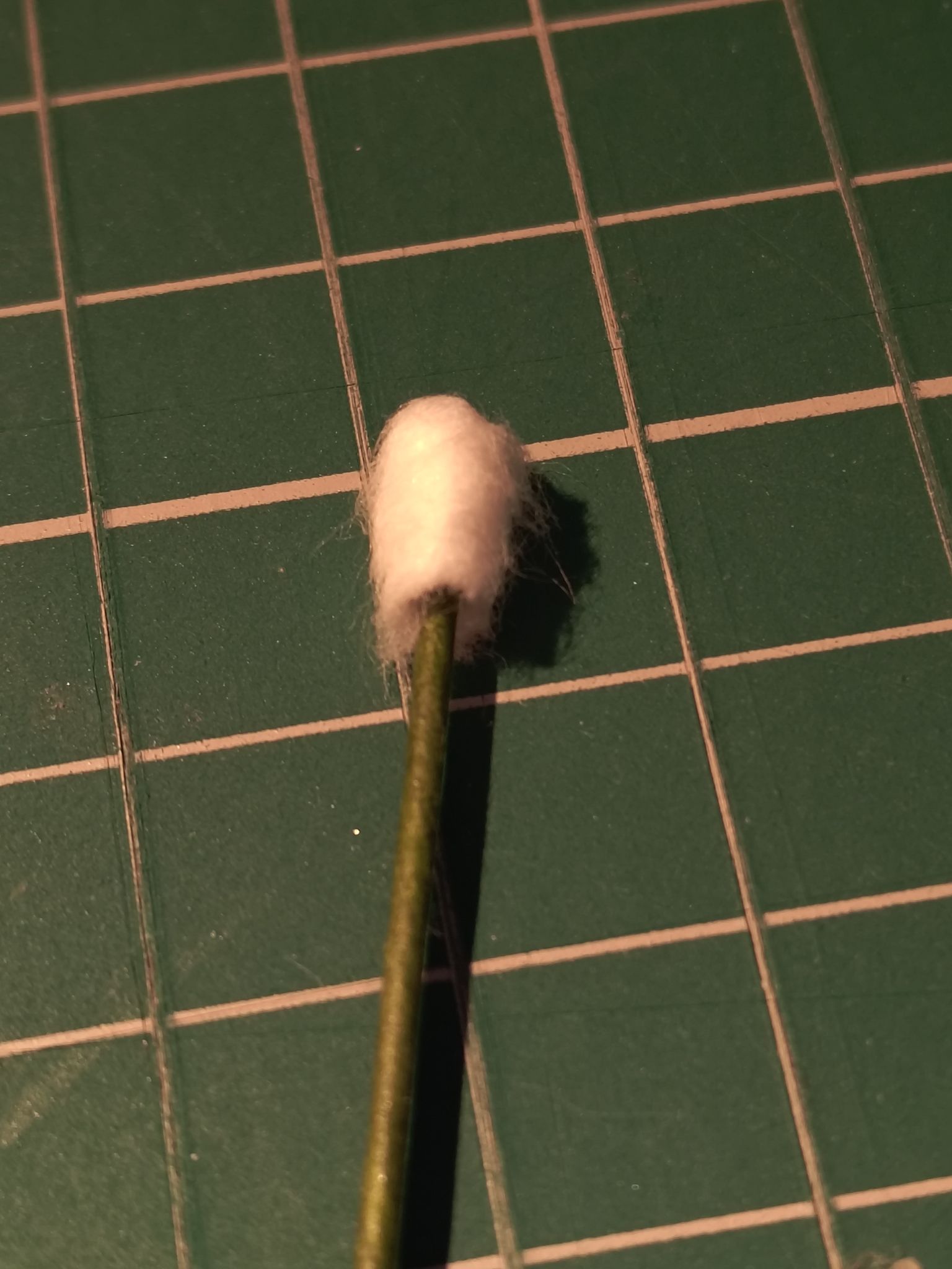 To make the stem for the main part, I cut off the end of a cotton bud and attached it to the tip of a sturdy papercraft stem. Then I wrapped dark green florist tape around the whole stem.