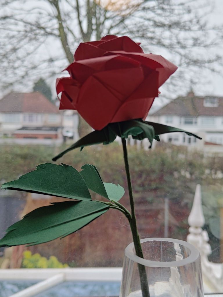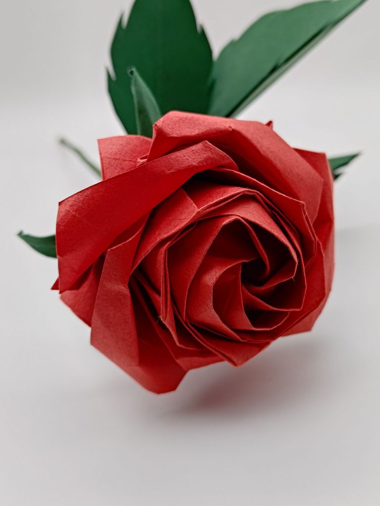I have folded pentagon roses before, with the rose bouquet (albeit poorly) and the small rose planter pot, but I wanted to make a really nice single rose not made from cheap A4 paper. I ordered some large 35cm Tant paper online – Tant is a type of paper that is holds creases well and has a slight texture to it, but it usually only comes in solid colours.